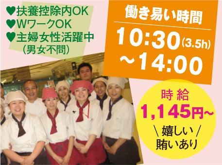 求めている人材 ◎未経験者も大歓迎♪ (親切指導で安心スタート) ・ご家庭での調理経験等も活かせます ◎調理や調理補助経験者尚歓迎 ・パート・アルバイト経験も大歓迎 ・経験年数不問!ブランク等も大歓迎 ※飲食店、食堂、外食産業全般、社員食堂、給食、各種施設(学校・保育園・病院・福祉施設・ホテル等の宿泊施設・寮・他色々) ◆男女不問♪学歴・経験・職歴不問♪・ ◆主婦さん・女性多数活躍中♪ ◆20代・30代フリーターさん活躍中! 40代・50代ミドル女性活躍中 ◆人気の10:30~14:00で収入UP! 平日/週2日~3日♪ ※研修制度充実(親切丁寧に指導) <こんな方々にもオススメ> ・食べる事や調理の好きな方! ・ゆとりある勤務がしたい ・家事や育児と両立したい ・土・日・祝日は休みたい ・アットホームな職場環境は魅力 ・近隣にお住まいの主婦、夫さん ♥扶養控除内OK♪ ♥10時半出勤!14時退勤♪