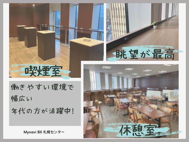 職場環境 ■チ・カ・ホ直結 シタッテサッポロの8Fにあり コンビニ・レストラン・カフェなども 近くにある便利なオフィスです ■充実の設備 個人ロッカー・広い休憩スペースあり 軽食販売コーナーあり お弁当持参OK 冷蔵庫・電子レンジ・ポットあり コンセント利用可 喫煙所:喫煙所あり(屋内)
