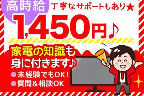 仕事内容 ー お仕事内容 ー \ 土日祝だけ★週末限定スタッフ募集! / 家電量販店のテレビコーナーで、 誰もが知る有名メーカーのテレビをご案内するお仕事です♪ 「テレビ販売って難しそう…」 と思われがちですが、 ▼ お客様へのお声がけ ▼ 画面の違いのご説明 ▼ リモコン操作のご案内 専門知識がなくても大丈夫◎ 事前研修があるので、 未経験の方でも安心してスタートできます! やる気があってしっかり稼ぎたい方、歓迎します★ 高時給1,450円だから、週末だけでも効率よく収入UPが可能です! 接客経験がある方はもちろん歓迎♪ 「人と話すのが好き」そんな気持ちがあればOKです! ー 勤務詳細 ー ★★高時給★★ ・時給:1450円 ※交通費別途支給 ・勤務時間:10:00~19:00 ※実働8時間 ・土日祝のみ勤務 ※フルタイムも同時募集してます! ・インセンティブ100%還元◎ \ 月収例(週末のみ)/ 1,450円×8時間×8日=92,800円+インセンティブ 週末だけでもしっかり収入確保◎ ー おすすめポイント ー ・土日祝のみ勤務 ・WワークOK ・国内大手メーカー担当で安心 ・高時給1,450円 ・販売経験が活かせる ・未経験も相談OK ・商品知識研修あり(時給同額+交通費実費支給) ・家電経験があれば50代以上も歓迎 ・20代~50代スタッフ活躍中!