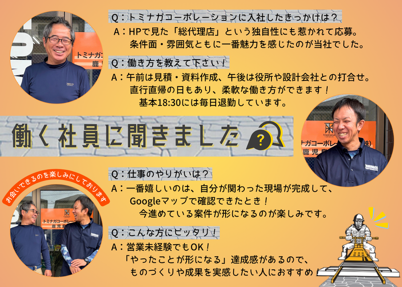 仕事内容 \\営業経験を“街づくり”に活かす!// ★鹿児島発、日本を変える営業へ★ 「ストリートプリント工法」日本唯一の総代理店! ✅トミナガコーポレーションとは? ▶私たちは、アスファルト舗装にレンガ調や石畳調のデザインを施す 「ストリートプリント工法」の日本唯一の総代理店です。 加熱した舗装に型押しし、専用塗料「ストリートボンド」で着色することで、 美しさと耐久性を両立した景観を生み出す独自技術です。 ✅次のステージは「売上50億・海外進出」へ ▶トミナガは今、まさに事業拡大フェーズの真っ只中。 2030年には「売上50億円・社員50名・海外展開」を掲げ、本気で次のフェーズに挑戦しています。 その中で鹿児島営業所も、単なる地域拠点ではなく、 “考えて動く営業”が育ち、拡大を支える戦略拠点として位置づけられています。 ✅ 建設業界でも珍しい、“働きやすさ”を実現した営業職 ▶ 残業ほぼゼロ! 家庭やプライベートと両立できる営業スタイル ▶ 子育て中の社員も活躍中!定時退社が当たり前の社風です ▶ 鹿児島で腰を据えて働きながら、営業スキル・提案力を磨けます ✅ 他にも働きやすさが満載! ✨年間休日124日 × 土日祝休み! 長期休暇もしっかりあり、オフの時間も充実できます◎ ✨賞与年2回+決算賞与あり! 業績に応じてしっかり還元。7年連続で支給実績あり! ✨SNSでも会社の雰囲気を発信中! 事前に雰囲気を確認してから応募もOK! ========================= ■HP/YouTube【トミナガコーポレーション株式会社】で検索 ■Instagram『tominaga_corp』 ■X(旧Twitter)『@tominagaCorp』 ========================= ✅仕事内容 ⏰具体的な業務の流れ ◆①顧客リスト作成 建設新聞や役所のHPなどをもとに、月30〜40件の見込み案件をリスト化。 問い合わせ対応も多く、新規アプローチへの不安が少ない環境です。 ▼ ◆②訪問・情報収集 鹿児島県内の自治体・工事会社へ訪問(直行直帰OK)。 1日4〜5件、各担当者と30分程度の対話を通じて関係性を構築します。 ▼ ◆③見積り作成・受注サポート 設計事務所や行政との打ち合わせを行い、見積提案・入札対応などを担当。 技術チームと連携し、案件化までのプロセスを推進します。 ▼ ◆④受注後の打ち合わせ 施工会社との日程調整・内容確認など、段取りを組み立てる役割です。 ※施工業務は専任の現場スタッフが担当します。 ▼ ◆⑤工事完了後のフォロー 工事後の現場訪問や評価ヒアリングを行い、次回の受注につなげます。 ✅この仕事の魅力 ▶ 自分の提案が“街の景観”として残る! 福岡・鹿児島だけでなく、全国の都市景観に関わるやりがいあり。 ▶ ストリートプリント工法は日本唯一の独自技術! 他社にはない優位性で、営業にも自信を持てます。 ▶ 施工実績も多数! ・東京タワー ・JR新宿東口 ・櫛田神社表参道 ・博多駅バスセンター周辺 など ✅働く社員にインタビュー! (Nさん|2024年6月入社/前職:日用品メーカー営業) (Oさん|2023年7月入社/前職:外装・インテリア関連) Q:入社のきっかけを教えてください! 【⏬Nさん】 前職は日用品メーカーで営業をしていましたが、商品の“薄利多売”に限界を感じていました。 「競合が少なく、独自性のある商材で勝負したい」と思っていた時に、偶然HPで当社を発見。 面接を通じて感じたのは、営業経験が活かせる環境と、収入アップの可能性、そして商材の分かりやすさ。 この3つが決め手となり、入社を決めました。 【⏬Oさん】 地元のハローワークで当社の求人を見つけたのがきっかけです。 HPに掲載されていたYouTube動画を見て、施工風景や社員の雰囲気がリアルに伝わり、「ここで働きたい」と感じました。 前職の経験も活かせそうでしたし、他社と比較しても条件面・会社の雰囲気ともに一番魅力を感じました。 Q:入社後の印象は? 【⏬Nさん】 面談時、採用担当の方が同業出身で、不安や悩みに共感してくれたのがとても印象的でした。 選考のスピード感や、社長や役員との距離感の近さも魅力に感じました。 業界未経験だったので、営業スタイルに慣れるまで少し苦戦しましたが、今ではしっかり成長を実感できています。 何より年収が前職より上がったのもモチベーションの一つです! 【⏬Oさん】 すぐに仕事に入れたので、スムーズなスタートが切れました! 午前中は見積作成や資料づくり、午後は役所・設計会社との打ち合わせが中心です。 直行直帰やフレキシブルな働き方も可能で、毎日18:30には退勤しています。 Q:仕事のやりがいは? 【⏬Nさん】 日本で唯一の独占商材を扱っているので、他社にはない提案ができるという自信と強みがあります。 なにより嬉しいのは、自分が関わった現場が完成し、Googleマップで確認できた瞬間。 「自分の仕事が街に残っている」と実感できるやりがいがあります! 【⏬Oさん】 提案が採用されて実際に形になるとき、「自分の行動がプロジェクトを前に進めた」と実感できます。 ストリートプリント工法という他にない技術を扱う環境だからこそ、自信を持