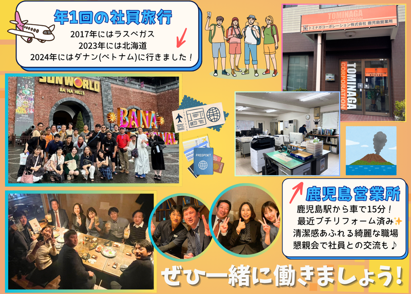 求めている人材 ≪必須≫ ・普通自動車運転免許(AT限定可) ≪✨社長インタビュー:どんな人と働きたい?✨≫ Q:どんな方と一緒に働きたいですか? A:礼儀正しく、一生懸命に物事に取り組める方。そして、笑顔で人と接することができる方です。 人と関わるうえで大切な“基本姿勢”を持った方を歓迎します! Q:学歴や経験は必要ですか? A:学歴・経験は一切不問です! 高卒・大卒・中途・未経験問わず、意欲重視で採用しています。 Q:ジョブローテーションはありますか? A:ご本人の希望を大切にしています。やりたいことがあれば、都度相談しながら進めていきます! Q:社長から最後に一言 A:トミナガコーポレーションの強みは「チームワーク」です。 あなたの持っている力を活かして、一緒に街の景観を明るく、美しくしていきましょう! ※営業経験者を前提とした採用ですが、 未経験の方でもポテンシャルと意欲があれば歓迎しています。 その場合は、半年〜1年程度、福岡本社での研修期間(OJT)を経てから鹿児島勤務となります。 この点については、ご希望や状況をふまえて柔軟にご相談させていただきます。 ≪こんな方に◎≫ ◎次のキャリアを真剣に考えている方 ◎計画を立てて、コツコツ行動できる方 ◎自分で考え、自ら動く“主体性”のある方 ◎チームやお客様との信頼関係を大切にできる方 ◎ワークライフバランスを重視し、家庭との両立を大切にしたい方 ◎子育て中でも働きやすい環境で力を発揮したい方 ◎「街づくり」や「景観デザイン」に興味がある方 年齢の条件と理由:あり(例外事由3号のイ・45歳未満(長期勤続によるキャリア形成のため))