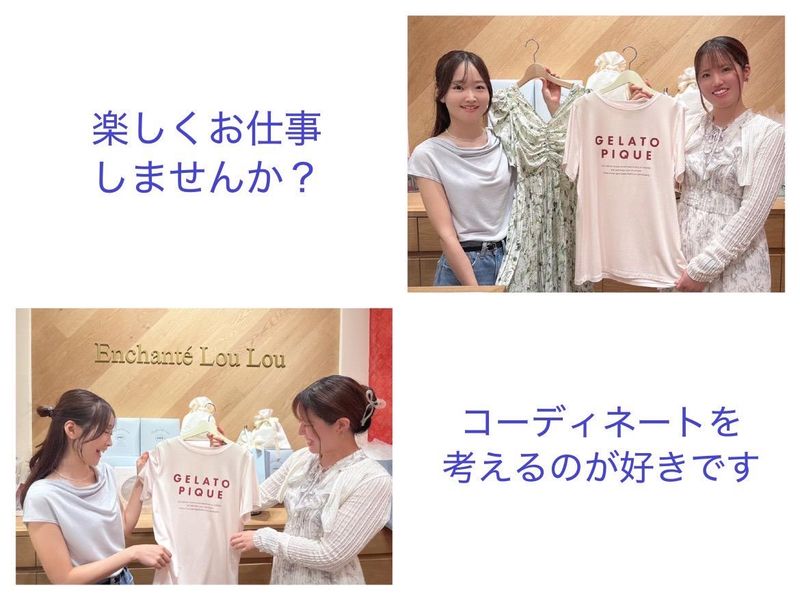 仕事内容 ✅社員割引あり ✅アパレル未経験歓迎! ✅ファッション、接客が好きな人歓迎 ▼▼主なお仕事▼▼ ・接客販売 ・ディスプレイ ・商品管理 など 上記のお仕事に慣れていったら… ・ストックの整理 ・マネキンの着せ替え ・売り場作り などもお任せしていきます! 「アパレル販売をやってみたかった!」 「コーディネートを考えることが好き!」 そんな方にオススメです♪ アパレルショップでの経験が無い方でも応募大歓迎! まずは服の畳み方から丁寧に教えていくので安心してくださいね。 ▼▼アンシャンテルルについて▼▼ 「Enchante Lou Lou(アンシャンテルル)」には 「魔法にかけられた女の子」という意味が込められています。 その名の通り、ファッションによって女性がまるで 魔法にかけられたように美しく素敵に変化できる ショップとして一人ひとりに合った コーディネートを提案しています。 セレクトショップとして、複数のブランドを取り扱っています。 ◇FURFUR ◇gelato pique ◇SNIDEL ◇COCO DEAL ◇LILY BROWN ◇LILIAN CARAT ◇ROYAL PARTY ◇ANDRESD ▼▼20代~30代が活躍中▼▼ 20代から30代の女性スタッフが元気に活躍中! 「アパレル店員になってみたい!」 「ブランクがあるけどまた働きたい!」 そんな方もぜひご応募ください♪ ▼▼ココならではの魅力▼▼ ・週3日~、1日5h~OK ・アパレル未経験も歓迎 ・交通費規定支給 ・社会保険完備 ・社員登用あり ・研修制度あり ・社員割引あり ・髪型、髪色自由 ・ネイル、ピアスOK ※身だしなみに関してはブランドイメージに合う範囲でおねがいします ▼▼正社員も採用中▼▼ 【雇用形態】正社員 【給与】20万3000円~23万円(スキルに応じて)+交通費規定内支給 ※経験者応相談 気になっていることや働き方など、ご質問があれば面接時にお聞かせください! 興味を持っていただけたらまずはご応募お待ちしています★