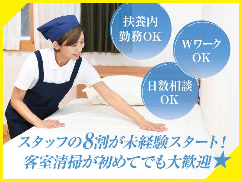 仕事内容 ■産後ダイエットしたい・・・ ■健康のために運動したいけど なかなか習慣化できない・・・ ■体を鍛えたい・・・ ホテル・旅館清掃のお仕事は、 そんな方にピッタリ! ジムに行かなくても、 給与をもらいながら、 運動も兼ねてお仕事ができます◎ ★お掃除の仕事をして、 ダイエットに成功した方の エピソードはスクロールした 一番下に掲載中! ぜひご覧ください♪ 前職が飲食店やサービス業、 接客業、事務など清掃のお仕事を したことがない方も活躍中! 勤務中はもくもくと 喋らない仕事だと思われがちですが、 意外と仕事中もおしゃべりしてます♪ ・最近見たドラマの話 ・子どもの話 ・旦那の愚痴 など、手は動かしながらも、 同僚のスタッフ同士で楽しく話しながら、 仕事することも多いので、 人と接することが好き! という方にもピッタリです★ ////// ここがポイント!! ////// ・8割のスタッフが未経験スタート! 難しい作業がないので、 ご家庭でのお掃除経験があればできる 簡単な作業ばかりです! 初めての方もご安心ください★ ・週2日から勤務可能! 扶養内勤務やWワークもOKです! もちろんフルタイム勤務も大歓迎! ・土日休みもご相談OK★ 急なお休みにも柔軟に 対応いたしますのでご安心を! お子さまの急な病気や学校行事などで 急に休みたいときも 気兼ねなく休めます! ご家庭や学校との両立も簡単です♪ ・送迎バスあり! ご自宅付近まで、 送迎バスがまいりますので、 通勤手段でお悩みの方も安心ですよ! /////////////////////////////// <具体的なお仕事> お部屋の掃除機がけ、 ベッドメイキング、机の拭き掃除など ホテル内の客室清掃(9:30~15:00)を お願いします! ※各現場により異なります 1フロア(20室)を3~4名で 清掃していただくので、 1人あたり、 1日約6~7部屋の清掃をお任せします。 チェックリストを見ながら進めるので、 未経験の方でも安心して お仕事していただけます! スタッフも8割が未経験スタート! 家庭でのお掃除経験があればできる、 簡単な作業ばかりなので、 初めての方もご安心ください♪ 分からない事あれば、 都度フォローしますので、 余裕を持って働いていただける環境です! ◆勤務場所は下記の中から ご希望の勤務地をお選びいただけます! ・大江戸温泉物語Premium 山下家(加賀市山代温泉124) ・大江戸温泉物語 ながやま(加賀市片山津町ム16) ・湯快リゾート 山中温泉 花・彩朝楽(加賀市山中温泉こおろぎ町イ93) ※送迎バスあり(ご自宅付近まで送迎) <1日の流れ> ※各現場により異なります 9:30~ 朝礼 ⇣ 10:00~ チェックアウトされたお客様のお部屋で清掃作業 ⇣ 15:00 退勤