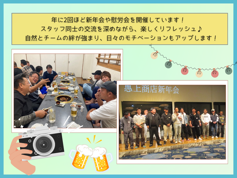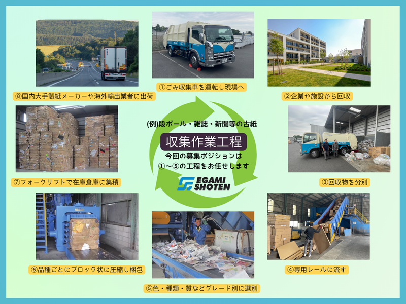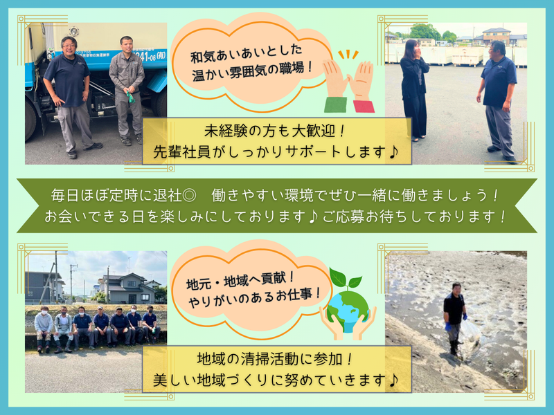 仕事内容 ✨【実働7時間⏰午前勤務のみも相談可能】✨ \収集運搬作業(ドライバー)スタッフ募集/ 私たち惠上商店は、古紙やリサイクル家電、発泡スチロールなどを回収し、再資源化を行っています。 「ただ運ぶ」だけではなく、「地球環境を守る」「地域の暮らしを支える」そんな誇りを持てるお仕事です♪ ✨転勤なし!地元で腰を据えて安心して働けます♪ ✨昇給・賞与・手当充実!日々の頑張りをしっかり評価◎ ✨未経験大歓迎!ゼロから丁寧にサポートします! ✨希望休も取りやすく、プライベートも大切にできる環境! ✨実働7時間の休憩2時間&基本定時退社!オンオフ切り替えて働けます◎ ✨午前中だけのパート勤務もOK!ライフスタイルに合わせてご相談◎ ✨20代~60代まで幅広く活躍中!年齢に関係なく馴染みやすい職場です♪ ≪仕事内容≫ 企業や施設を巡回し、決まったルートでゴミや古紙、リサイクル品などを回収・運搬します。 午後はチームで分担して、古紙の圧縮などの作業を行います。 【主な回収品】 ■可燃ゴミ ■段ボール ■びん・カン・ペットボトル ■粗大ごみ ■リサイクル家電など 未経験の方も安心◎特別なスキルや経験がなくても大丈夫!✨ ルート作業&チーム制なので、仕事の流れを覚えやすく、慣れるまでは先輩がしっかり横についてサポートします! 「誰かの役に立つ仕事をしたい」「安定した環境で働きたい」そんな方にぴったりです! 【1日のスケジュール例】 08:00 朝礼・準備 08:20 ルート回収スタート 12:00 昼休憩 13:00 午後の回収・圧縮作業(チームで分担) 16:00 搬入・荷下ろし 17:00 退勤!お疲れさまでした! ≪社員インタビュー≫ Q:惠上商店で働いてみて、どんなところに魅力を感じていますか? ✅Aさん「免許があればOK!経験ゼロからでも大丈夫!」 はじめは不安もありましたが、OJTや研修がしっかりしていて、すぐに仕事に慣れました。 困ったことも気軽に相談しやすく、温かい雰囲気の職場です! ✅Yさん「地域に根ざして、長く安心して働ける」 転勤がなく、地元でずっと働けるのが魅力! 20代〜60代まで幅広い世代が活躍中で、人間関係も落ち着いていてとても働きやすいです! ✅Tさん「家庭との両立ができるのがありがたい!」 基本17時退社で、家族との時間も大切にできます! 有休も取りやすく、連休も相談しやすい職場です! ✅Mさん「頑張った分は、きちんと給与や手当で還元される!」 昇給・賞与に加えて、早出や休日出勤にも手当がつくので、やりがいがあります! 新年会や慰労会もあり、チームの仲もとても良いですよ! 「毎日が、ちょっと気持ちいい」そんな仕事がここにあります! 自分の手で地域を支え、環境に貢献できるやりがいのあるお仕事✨ 最初の一歩に不安がある方も、ぜひ一度、職場見学に来てみてください♪ お会いできるのを楽しみにしております!