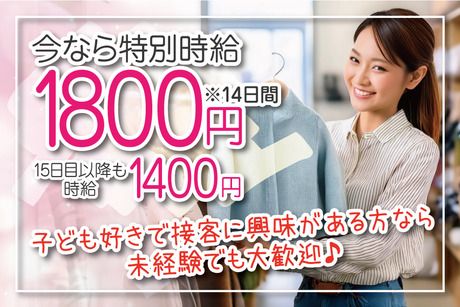 仕事内容 カラフルでミニサイズのかわいい洋服に囲まれてお仕事♪ キッズ~ベビーのかわいい子供服や雑貨など 幅広いアイテムを取り扱うショップ店員さんを大募集!! お客様に気持ちよくお買い物をしてもらうためのお手伝いをお願いします♪ <主なお仕事内容> ◆お客様対応(接客) ・希望される商品の場所までご案内 ・サイズ選びのお手伝い ・フィッティングルームへのご案内 ◆バックヤード業務 ・届いた段ボールの開封 ・商品のチェック、検品 ◆売り場や商品整理 ・店頭の商品の補充 ・お洋服のたたみ直し ◆その他の付随する業務 ・レジ、会計補助 ・お店の清掃 ・オープン、クローズ作業 いきなり全てをお任せすることはありません◎ まずは簡単なお仕事から始めてお店に慣れていってください。 週3日~OK!1日6時間~ご都合に合わせて働けます◎フルタイムも歓迎! 家事や育児と両立して働く主婦さんから、 フルタイムでガッツリ働くフリーターさんまで活躍中! 条件が合えば学生さんも歓迎♪ 『人と話すことが好き』 『子育てが一段落したから、またフルタイムで働きたい』 『働きながらオシャレも楽しみたい』 お子様が好き・オシャレ好き、そんな方には最適な環境です! 未経験の方大歓迎!イチから丁寧にお教えするので安心して始められます♪ 子ども好きで販売・接客のお仕事に興味がある方なら 経験なくても大歓迎☆ 商品の知識からレジの使い方まで しっかり順を追ってお教えします◎ まずは明るく挨拶できればOK! できることを少しずつ増やしていってくださいね♪ ★オススメポイント★ 【1】身だしなみ自由! ネイル、ピアス、髪色、服装なんでもOKです! ぜひあなたらしくお仕事を楽しんでください♪ 【2】ノルマなし! 無理なお声がけは行いません。 お客様の相談に乗り、気持ちよくお買い物していただくことがミッションです★ バックヤード業務もあるのでモクモク作業が得意な方にもオススメ♪ 【3】2~3ヶ月の短期スタートOK! 「職場に馴染めるか分からない…」 「アパレルは初めてで不安…」 という方も、お試しで始められるのでご安心ください。 【4】来社・履歴書不要! 応募後にご希望条件のヒアリング(5~10分程度です) ↓ WEB上でスタッフ登録 ↓ 即日でのご紹介が可能です♪