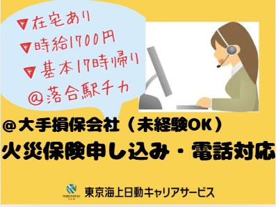 仕事の内容 \未経験OK!受電&入力など/ ◆慣れたら週2日で<在宅ワーク> ◆ほぼ残業なし!@時給1700円 ◆@落合駅・東中野駅チカ! 【基本情報】 雇用形態:派遣社員 雇用期間:長期(3カ月以上) 2月~開始日相談可能 就業時間:9:00~17:00(休憩60分) 【必須条件】 ◆パソコン:基本操作(入力~修正) 【お仕事内容】 WEBで販売しているダイレクト商品(火災保険)に関する業務 ○受電 ↓ ○WEB画面を確認! ・引き受け条件など問い合わせ ・WEB操作が苦手な方へのサポート └ヒアリングして入力~見積書をメール送信! ◆慣れたら…1時間に約2本の受信対応 ◆働く環境が抜群に整っています☆彡 └大きなデスクトップのPC、ひとりずつ仕切られた広いデスクで快適にオシゴト捗ります! ◆繫忙期:1~3月 └忙しい時期が予めわかってるので予定が立てやすい♪ 【環境面等】 ・30代・40代の多い職場 └派遣スタッフ活躍中 ・フリーアドレス制の快適オフィス ・在宅ワーク実施中(現在は週2日程度/PC貸与応相談/インカム貸与あり) ・オフィスカジュアル内で服装自由 【福利厚生等】 ・ランチタイムは休憩スペース利用OK! └電子レンジ使用OK!お弁当持参OKです/周辺にはコンビニや飲食店などが充実 └自動販売機やバランスボール・本や卓球台等があり開放的なフリースペース◎ ・ベネフィット・ステーション ・社会保険完備 ・定期健康診断あり ・禁煙オフィス!煙苦手な方も安心 ・平日のみOK!土日祝休み ・年間休日120日以上&お休み相談可 └有給休暇 ○●応募検討中の方へ●○ 安定した環境で、無理なくお仕事したい方にぴったりの職場です!ご応募お待ちしています! ○●嬉しいPOINTたくさん!●○ 履歴書不要!開始日相談/長期/駅歩5分以内/主婦・主夫活躍中/社保完備/残業なし!17時退社OK/7時間以内勤務@1700円