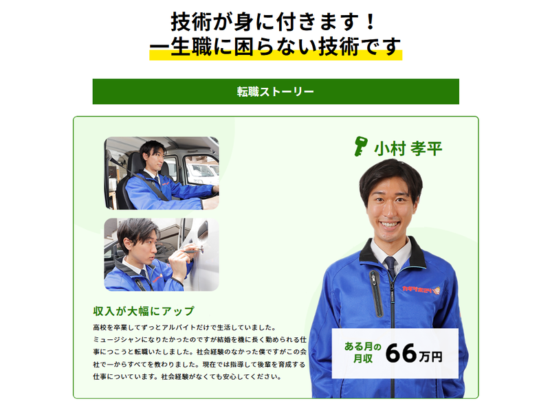 仕事内容 「鍵がなくて家に入れない…」そんなお客様のもとへ駆けつけ、鍵を開けたり作ったりする仕事。 平均月収は45万円。たとえばシンプルな住宅の鍵開けは、1件につき安くても1万以上。車の鍵製作は6万弱、鍵の取り付けは8万以上。ピッキングしにくい『ディンプルキー』の鍵開けは、何と10万超え。これだけで計25万円以上にもなります。 依頼は1日平均3~4件、多くて10件。コツコツ応じて着実に稼げるため、大半の社員が入社半年~1年で月収45万円に達します。 入社後は専門学校(受講料無料)での座学と、先輩の指導があるため安心。技術を磨けば対応できる種類が増え、作業時間も短縮でき、より多くの依頼をこなせるようになります。稼ぐために心をすり減らすのは、もうやめにしませんか? 【具体的な仕事内容】 ▼依頼が入る 「鍵をなくしてしまった」といった個人のお客様からの依頼や、「入退去に伴って鍵を交換したい」といったマンションの大家さんからの依頼が中心。コールセンタースタッフが受けつけ、カギサポ24のスタッフに連絡が入ります。 ▼現場で作業をする お客様のもとへ社用車で駆けつけ、専門の道具を使って交換・開錠をします。家の鍵をはじめ、ベランダ、金庫、車、車のエンジンの鍵など、ありとあらゆる鍵に関するトラブルを扱います。 【仕事のポイント!】 ◎各所から必要とされている仕事です。 一般のお客様だけでなく、お年寄りの安否確認や、警察からの依頼(強制捜査)で開錠をすることもあります。官公庁や大手有名企業とも取引実績あり。各警察署から感謝状も多数いただいています。