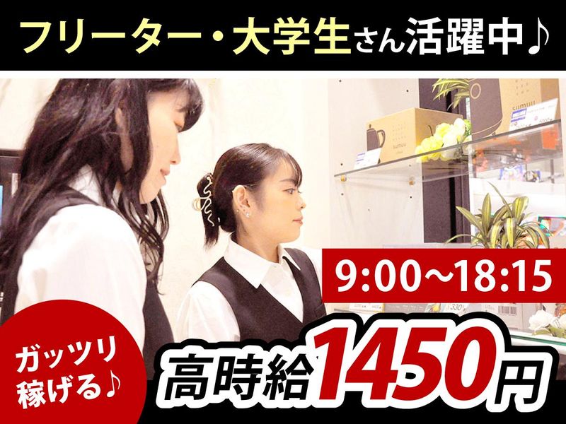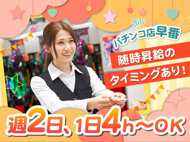 仕事内容 ・。゜゜☆。・・。☆゜゜・。 ✨ ホールSTAFF募集 ✨ ・。゜゜☆。・・。゜゜☆。・ 「楽しく働きたい!」そんな アナタにピッタリなお仕事です♪ ✅ 未経験でも安心の研修アリ ✅ 電子タバコのみで匂いの心配ナシ ✅ 重たい物の持ち運びほぼナシ ゜+.――【おしごと内容】――.+゜ パチンコ店のホールで、受付や接客をお任せ! 「〇〇さん、今日は調子どう~?」 なんてお客様とちょっと雑談したり、 楽しく過ごしていただけるように サポートするお仕事です☆ ⭐笑顔で「いらっしゃいませ!」が 言えればOK! ⭐研修ありで未経験でも安心 ・。・。・。・。・。・。・。 ゜+.――【働きやすさポイント】――.+゜ ✨未経験でも時給1450円以上! ✨昇給も随時あり♪ ✨シフトは週2日~・1日4h~OK! 「スキマ時間だけ」も 「ガッツリフル」も大歓迎 ✨フロアでは電子タバコのみOKだから、 服や髪に匂いがつかない♪ ✨重たい荷物の持ち運び少なめで 体力に自信がなくても安心◎ ・。・。・。・。・。・。・。 ゜+.――【職場の雰囲気】――.+゜ ⭐スタッフ同士めちゃ仲良し⭐ 仕事終わりにバックルームで おしゃべりが盛り上がって、 そのまま「飲みに行こうよ~!」なんて 流れになることも◎ 気さくで楽しい仲間が待ってます! ・。・。・。・。・。・。・。 ゜+.――【お客様について】――.+゜ 来店される方の7~8割は常連さん。 新人さんでもすぐに覚えてもらえて、 「今日も頑張ってるね~」なんて 声をかけてもらえることも♪ ☆。◎✨「楽しく働きたい」 ☆。◎✨「自分らしく稼ぎたい」 そんなアナタにピッタリのお仕事です♪