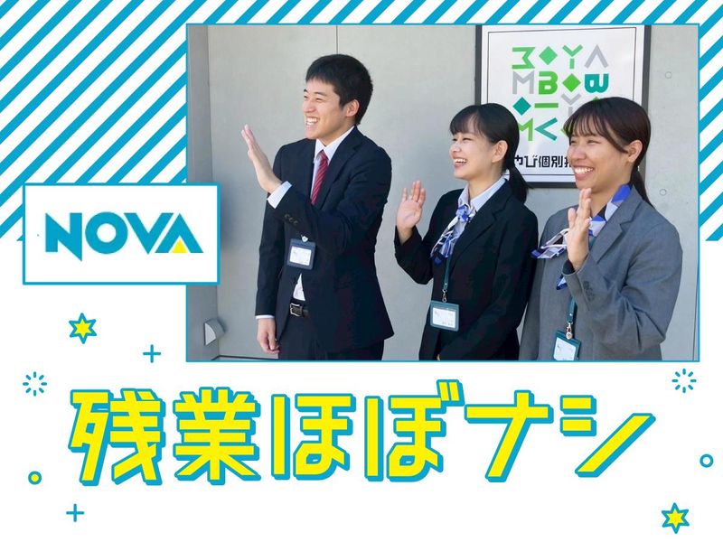 仕事内容 ~~~~~~~~~~~~~~~~~~~~ *未経験歓迎!完全週休2日制/土日休み! *残業月平均36分!プライベートも安心! *未経験から月給30万!福利厚生も◎ *レベルに応じた充実の研修制度あり! *1週間の長期休暇が年3回!(規定) *安定企業で確実なキャリアを築ける! ~~~~~~~~~~~~~~~~~~~~ 【仕事内容】 「駅前留学NOVA」で有名な株式会社NOVAがFC運営する個別指導塾にて、教室長候補として、教室運営業務全般をお任せします。 ~~ 具体的には 〇受付対応、入塾のご案内 〇生徒の進路相談・学習指導計画の立案 〇保護者面談 〇担当講師の選定 〇授業のスケジューリング 〇入出金管理 〇書類作成(保護者への案内、校舎通信、面談前の提案書など) 〇生徒満足度の向上や集客施策の立案・実行 〇アルバイト講師の管理 など ~~ 入社後について 入社後はまず本部の研修が3日間、その後1ヶ月間のOJT研修(現場研修)をエリアマネージャーや先輩社員がマンツーマンで実施します。 1ヶ月程度でのひとり立ちを目指していただきますが、わからないことなどがあれば近隣校舎の先輩社員やエリアマネージャーに電話・メール・LINEでいつでも確認できる環境があるので安心! ★充実した研修制度★ ひとり立ち後も、月に1回のフォローアップ研修が半年間設定されており、同期との情報交換や悩み相談ができる場を設けているので、仲間と一緒に頑張ることができます! ★スキルアップも可能★ 季節講習前の保護者面談や売上向上施策、その他取り組みなどを講義やロープレ形式で学ぶこともでき、継続的にスキルアップをサポートする環境が整っています◎ ~~~~~~~~~~~~~~~~~~~~ 【生徒とじっくり向き合える環境】 ―――――――――――――――――――― 個別指導塾の教室長は生徒の個を大事に、一人ひとりに寄り添いながら成長をサポートできる、やりがいのある仕事です。 「教育業界で働き続けたいけれど、ワークライフバランスも大切にしたい」と考えるあなたにも、当社は「完全週休2日制(土日休み)」「残業もほぼ無」なので、働きやすい環境を提供しております◎ 【ワークライフバランスの実現】 ―――――――――――――――――――― 当社では女性社員比率も高く、産前産後休暇・育児休暇の取得・復職実績も豊富! 年間有給取得平均日数も7.1日と休みやすい環境なので、将来のライフイベントや生活の変化を見据えながら長く安心して働くことができます◎ また、「奨学金代理返還制度」「学習塾・子ども英会話の授業料無料」「英会話レッスン社員割引」など、大手企業ならではの福利厚生をご用意しているので、長期で働きやすい環境です◎ 【安定基盤で長期安定を】 ―――――――――――――――――――― 当社はNOVAホールディングスグループの一員であり、「駅前留学NOVA」のブランド力を活かしつつ、さまざまな取り組みにも高い評価をいただいている安定企業です。 塾校舎での英会話受講や海外留学のご相談にも対応できるなど、他塾には真似できない独自の教育サービスを強みに、安定した経営を実現しています。 【みやび個別指導学院について】 ―――――――――――――――――――― 個別指導の学習塾だからこそできるきめ細やかな指導で、お子様の自信とやる気を引き出します。 また、学習効果を最大限引き出せるようこだわった学習環境、自慢の講師クオリティ、万全の定期テスト対策など、お子様の学習をしっかりサポートします。 ~~~~~~~~~~~~~~~~~~~~