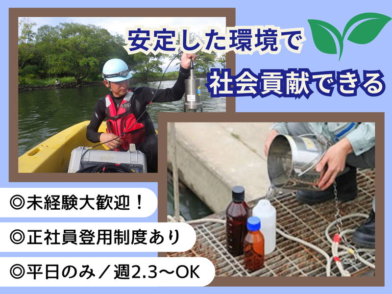 仕事内容 ✨未経験OK!特別な知識は必要ナシ◎ ✨平日のみ*土日祝休み ✨フルタイムで働ける方歓迎! ✨週2.3日~、1日4時間~OK ✨20代・30代中心に男性活躍中 ✨社員登用あり 【具体的には…】 社用車で現場に向かい、 工場等の空気の測定や排水の水質調査、 河川や湖などの環境調査のお仕事。 例えば、 特定の工場や採取場所へ向かい 決められた箇所からマニュアルに沿って採水。 といった作業 など いろんな現場へ行くことがあるので、 アクティブな性格の方にピッタリです! <入社後は…> 先輩スタッフが、仕事の流れから 丁寧に教えますので、 一緒に業務を進めながら 仕事を覚えていってください。 協力して業務を進めているので、 困ったときは、何でも聞いてくださいね。 ✅未経験OK!特別な知識は必要ナシ◎ 重たいものを運ぶ作業はありますが、 難しい工程や危険な作業はありませんので 未経験の方も安心してスタートできます。 *** <当社について> 私たち『株式会社環境総合リサーチ』は 設立47年、株式会社建設技術研究所の グループ企業として 官公庁や企業からの依頼を受け、 環境分析や調査を行っています。 注目度の高い”環境”分野の事業だからこそ、 今後も必要とされるため安定性も高く、 やりがいも大きい仕事です。 あなたのご応募をお待ちしています。