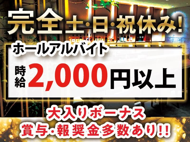 仕事内容 <ホールアルバイト> お客様のご案内や交換物の配膳、 キャストフォローなどのホール業務。 未経験スタートの方には 仕事を丁寧にお教えします。 もちろん経験者は即戦力として歓迎!! ☆希望者は社員登用もあり♪ ~~~ 野心・向上心・探求心! 社員一人一人の貴重な想いを全力でバックアップ! 必ず成功へ導くことをお約束します☆ 未経験スタートでも昇給率、 昇格例は銀座TOPクラスの実績を誇ります! ◆環境面も整えております ・パワハラなどのコンプライアンス違反の撲滅 ・長時間の残業や違法就労の禁止 ◆給与面でも業界最高水準を誇ります ・毎月昇給査定を実施 ・高額歩合、大入りボーナスも支給 ▼注目Point紹介!  ̄ ̄ ̄ ̄ ̄ ̄ ̄ ̄ ̄ ★高収入を目指せる環境! 未経験スタートでも時給2000円以上。 頑張りに応じて昇給チャンスも随時あり! ★安定ペースで勤務OK◎ 勤務日数・時間などは相談に応じます。 きっちり休みを確保できるので、 プライベートも充実させられますよ♪ ★自分磨きできる環境! VIPクラスのお客様への接客を通じて 一流のサービススキルと 将来に繋がる人脈が得られます!