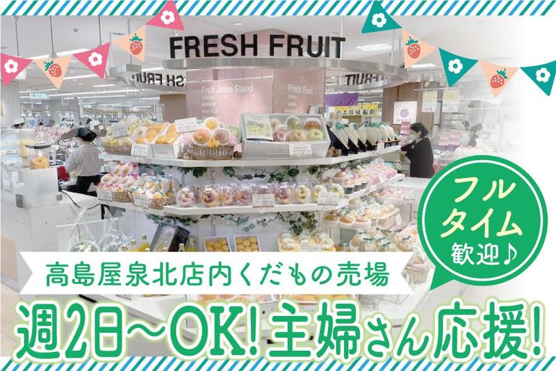 仕事内容 ───────────────── ❀✿ 週2日~、フルタイム ✿❀ ───────────────── ⭐Wワーク・土日のみの勤務も可◎ ⭐フリーター・主婦パートさん応援♪ 【 フルーツジュースと果物販売 】 果物・フルーツジュース・贈答用ギフトの 接客・販売・陳列・梱包のお仕事 まずは簡単なお仕事から順を追って お教えするので安心してください★ 最初の1ヵ月は3人体制で始め、 その後2人体制で行います。 しっかりとサポートしますし 研修もあるので、1ヵ月あれば 一通りの業務が覚えられますよ! ─────────────────── ❀✿ 定着率×居心地のよさ抜群! ✿❀ ─────────────────── フルーツの知識や販売経験は必要ナシ★ 基本2人体制◎サポート体制も抜群なので 未経験の方でも安心して働けます♪ < 定着率バツグン > スタッフ同士、年代を問わず仲が良いので 職場の居心地がとっても良いんですよ♪ 勤続10年以上のスタッフも在籍しています! 休憩中は楽しくお喋りをしたり、 お子さんの相談事をすることもあるくらい、 皆さん気さくな方ばかりです! ★主婦(夫)&フリーターさん応援! 子育てが落ち着き、久しぶりにお仕事復帰を考えているブランクさんも応援♪ 家庭、Wワークと両立しながら働くスタッフも多数活躍中! ─────────────── ❀✿ おすすめポイント♪ ✿❀ ─────────────── ✅高島屋内に休憩室完備 ✅社員食堂有 ✅社員割有(入社3ヵ月後~) ▶高島屋内でどこでも使用可能☆ お仕事終わりに夕飯準備など お買い物をしてから帰る 主婦スタッフもいます!