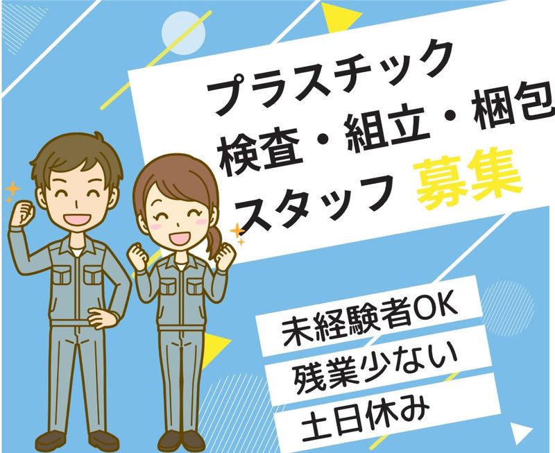 仕事内容 〓〓 お仕事内容詳細 〓〓 ・機械から出てきたプラスチック製品のバリや汚れのチェック ・手作業での簡単な組立 ・シール張り ・商品を段ボールへ梱包 未経験の方でも活躍できる簡単なお仕事です 〓〓 ここがポイント! 〓〓 ・土日休み ・残業ほぼ無し ・未経験OK ・長期就業OK ※就業前に、職場見学が出来ますので見て納得、安心して働くことが出来ます。