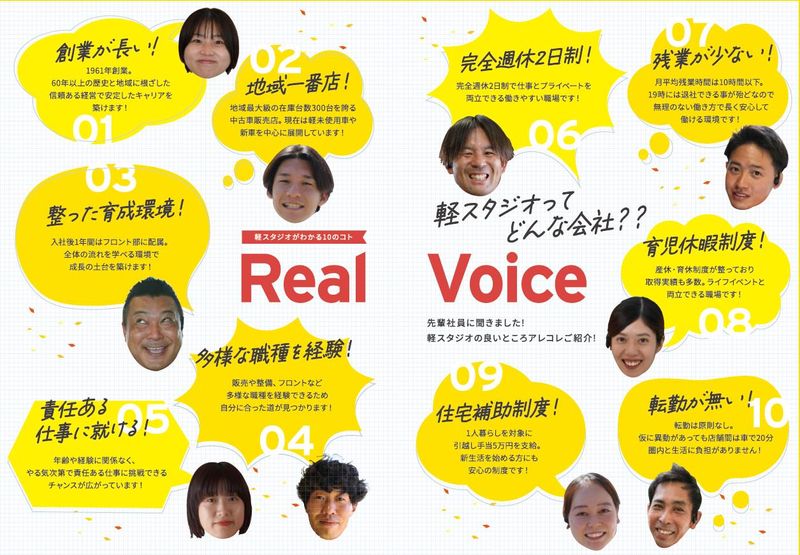 仕事内容 ☆...━━━━━━━━━━━━━━━━━ 未経験から活躍する“プロ整備士”へ じっくり教え、育てる環境あり◎ ━━━━━━━━━━━━━━━━━...☆ \\ CHECK POINT // ★未経験歓迎◎教育&サポート体制万全 ★完全週休2日制(火・水) ★賞与年2回 ★残業ほぼなし◎19時には全社員退社! ★家族・役職手当など、各種手当充実 ★個人ノルマなし!店舗目標達成で手当支給 ★シーズン休暇あり/メリハリワークが叶う 未経験からプロの整備士を目指せます。 まずは「3級自動車整備士」の取得に挑戦! OJTの実施や、学科講習も会社負担で 受講できる体制を整えています。 *..*..* 【 業務内容 】 ■点検 自動車の点検・整備・修理を担当! オイル交換や定期点検、日常点検などのサポート、ハンドルやブレーキの操作性、部品の消耗具合などをチェックし、必要に応じて修理や部品交換などを行います。 ■車検 保安基準に適合しているかを確認し、必要な整備や検査など一連の作業を担当! この業務には「自動車整備士」や「自動車検査員」の資格が必要です。 ■板金 自動車ボディ修理やコーティング施工を担当! へこみや傷の修理、事故修理、フレーム修正、パーツ交換などを行います。 【 将来的には 】 お客様から車の状態をじっくりヒアリングし、 部品の交換や修理内容を決めたり 次回の車検まで安全に乗っていただくための提案をお任せ◎ お客様に「安全」「安心」を 届けることを一番に考えてください。 深い知識や経験が必要なだけに やりがいは大きいはず――。 これら全て経験し、 プロの整備士を目指しましょう! ━━━━━━━━━━━━━━━ さらなるステップアップへ ━━━━━━━━━━━━━━━ まずは「3級自動車整備士」取得を目指し、 その次は「2級自動車整備士」「審査員」の 資格取得に向けて手厚い教育や サポート体制をバッチリ整えています! 働きながら、一生モノのスキルが手に入ります。 ━━━━━━━━━━━━━━ 『軽スタジオ』について ━━━━━━━━━━━━━━ 私たちは 兵庫県内でトップクラスの 未使用軽自動車専門店です。 地域に密着して経営を行い、 エリア内でのシェア拡大に全力を注いでいます。 年間1万台以上のオイル交換、4,000台近くの車検、 そして1,000台以上の車両販売実績が それを証明しています。