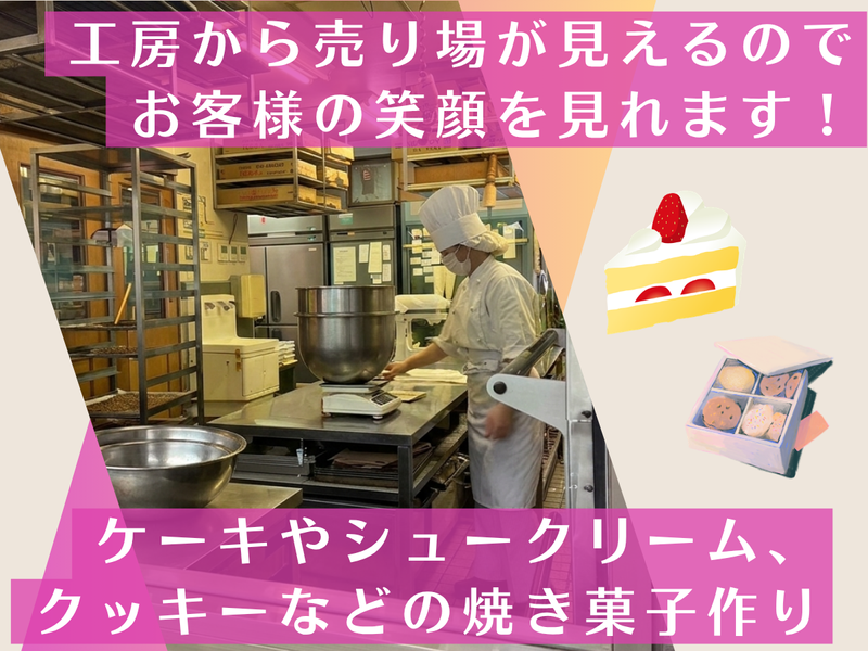 仕事内容 ⸜⸜ ✨社会人デビュー応援✨⸝⸝ 長年愛される洋菓子店の製菓職人 ╭──────────・⭐・・─── ✨週休2日制(火水休み) ✨未経験・社会人デビューもOK ✨経験者歓迎!ブランクOK ✨車通勤OK/交通費支給あり ✨昇給あり・賞与年2回 ✨退職金制度あり ╰─・・⭐・──────────── 店内、外から工房が見えるので、 お客様の反応を見れるのも 楽しみの1つ! やりがいと緊張感を持って 働ける環境です◎ ˚✧₊˚✧₊˚✧₊˚✧₊˚✧₊˚✧₊˚✧₊˚✧₊˚✧₊˚✧₊˚ ⏩取り扱い商品 ケーキ各種、シュークリーム、プリン 生チョコレート、焼き菓子など ※経験等は不問ですが、 出来立て商品の注文や、 販売スタッフから声掛けもあるので、 テキパキと作業にあたれる方で お願いします。 ▼▽▼ おススメポイント ▼▽▼ 当店は、 横浜市で約30年愛され続けている 洋菓子店です。 お客様に、より美味しいお菓子を 食べていただくため、 こだわりの食材を使用し、 できる限り作りたてを提供しています。 バームクーヘン専用オーブンや ストーン・ローラーなど、 設備や道具も最高のものを導入しています。 お菓子の味だけでなく、 見た目や品質も大事にしており、 妥協を許さないからこそ、 職人としてスキルを磨きたい方に ピッタリの環境です。 ˚✧₊˚✧₊˚✧₊˚✧₊˚✧₊˚✧₊˚✧₊˚✧₊˚✧₊˚✧₊˚