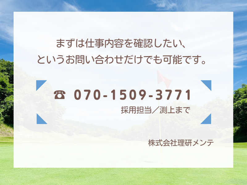 仕事内容 ■ 作業内容は決まった手順が中心 ■ 重いものを持つ作業はほとんどなし ■ 未経験から始めている社員も在籍 ゴルフ場コース内での屋外作業が中心。 芝刈り機や小型機械を使い、 コースを整えるお仕事です。 朝は早めですが、夕方には仕事が終わるため 生活リズムを作りやすい働き方です。 ――――――――――――――――――― 【具体的な仕事内容】 ○手押し芝刈り機を使った 芝生のメンテナンス ○小型機械を使用した バンカー(砂場)の整備 ○コース内の簡単な清掃・確認作業 ○機械の簡単な点検・管理 (専門整備ではありません) ※作業は複数名で行います ※最初から一人で任せることはありません ■勤務地: 吉井南陽台ゴルフコース事業所 ――――――――――――――――――― 【未経験の方でも活躍できる理由】 作業手順は決まっており 複雑な判断業務は多くありません。 使用する機械も小型のものが中心で 操作方法は現場で順を追って説明します。 現在在籍しているスタッフの中にも 未経験で入社した方がいます。 ――――――――――――――――――― 【職場について】 ・屋外作業が多い職場です ・決まった作業をコツコツ進める仕事が多め 勤務開始日はご相談ください。 現在在職中の方も気軽にご応募ください。 ご応募お待ちしております。 ―――――――――――――――――――