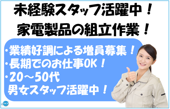 PR・職場情報 =====ここがポイント===== ■製造・組立未経験OK! ■長期のお仕事! ■30代・40代・50代の 幅広い年齢層の男女活躍中! ■うれしい土日祝休み! ==================== ▼安心のフォロー体制▼ 就業してからも当社営業スタッフがしっかりフォローしますので、派遣が初めての方や未経験のお仕事に不安のある方も安心してお勤めいただけます!! 20代~40代の年代の方が大活躍中!お仕事内容の問い合わせだけでもお気軽にどうぞ! 求人の特徴 【お仕事開始までの流れ】 STEP1: 営業社員との面談、登録 STEP2: 職場見学 STEP3: 入社書類取り交わし STEP4: お仕事開始 ※平日18時以降の面談やオンライン対応も可能です。ご希望の方は遠慮なくお問い合わせください! - この求人以外に派遣・バイト・アルバイト・パートや軽作業、製造、事務 のお仕事に興味のある方、短時間、短期・長期歓迎です。 上越市、糸魚川市、妙高市でお仕事をお探しの方、 未経験、ハローワークでお探しの方もお問い合わせください。 - 〒943-0805 新潟県上越市木田2丁目1番1号 7F-2 株式会社 NCI 上越支店 T E L:025-530-7272 F A X:025-530-7283 freedial:0120-62-2011 (※お電話にてご応募の際は「求人サイトを見て」とお伝えください!) 一般労働者派遣事業許可番号:派07-300732 職業紹介事業許可番号:07-ユ-300310 求人ポイント 交通費支給,即日勤務OK,主婦・主夫歓迎,長期,フリーター歓迎,バイク通勤OK,給料前払いOK,学歴不問,車通勤OK,残業月20時間以内,平日のみOK,転勤なし,未経験者歓迎,リモート面接OK,研修あり,社会保険完備,制服貸与,ブランクOK,育休制度あり,U・Iターン歓迎,家庭都合休OK,禁煙・分煙,長期休暇あり,40代以上応募可,第二新卒歓迎,産休制度あり,週5からOK,産休・育休取得実績あり,固定時間制