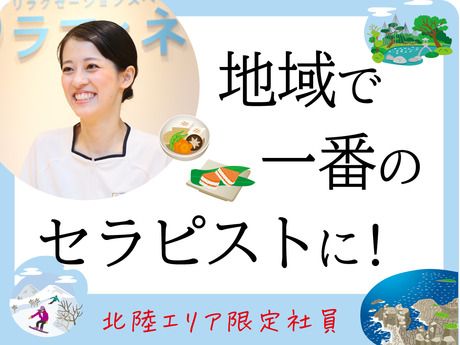 仕事内容 <お仕事内容> ボディケアやリフレクソロジーをメインに、お客様のお疲れの部位をゆっくりもみほぐし。 その手一つでお客様に最高の癒やしの時間をご提供します。 「肩が軽くなった。ありがとう。」 「身体が楽になった。ありがとう。」 と言われることもとても嬉しい瞬間です! 施術から接客まで、一人のお客様を一人のセラピストがおもてなしします。 <未経験90%以上!多くのセラピストを育てた自慢の研修!> 給与を得ながら研修が可能です! お店の配属前に約34日間に渡り、丁寧に研修します。 お客様に最高の癒やしを提供することを使命にしている我々は、プロとしてしっかりスキルを身につけてから配属となります。 ボディケア、リフレクソロジーの技術を、解剖学に基づいた正しい理論と共に座学&実戦形式で学びます。 配属後も多くの実践経験を踏めるだけでなく、スキルを高められる研修も随時用意しているので、成長スピードも圧倒的です! <一生モノの資格とスキルが手に入る> 全国セラピスト協同組合のセラピスト検定「初級」「中級」「上級」(厚生労働省認可)を取得することが可能です。 現場には高い技術レベルのセラピストが多く在籍しており、なかにはリラクゼーションの全国コンテストにおいて、グランプリや上位入賞の経験者も! よい刺激を受けながら、高みを目指すことができる環境です。 <北陸地方で働く> 育った地元で働きたい。 そんな主に応えるために「エリア限定社員制度」をつくりました。 決められたエリアの中のみでの勤務。 もちろん、転居を伴う引っ越しの場合、社員寮・家賃負担・引っ越し費用補助などで手厚くサポートします。 また、北海道から沖縄まで、日本全国750か所以上にお店を構える当社。 いつかお住まいを移すことになったとしても、ここで学んだ技術を活かして、変わらずに仕事を続けることができます。 先輩セラピストの中には、独立してハワイで仕事をする夢を叶えた人もいるんですよ! <待遇、手当…安心の正社員採用> 賞与は年2回支給。 役職やランクアップに応じて手当も増えていきます。 「こんな時代だからこそ、ゆるぎない技術を学びたい」 「自分の人生の舵を、自分で取れるようになりたい」 あなたの新しい一歩を、私たちに応援させてください!