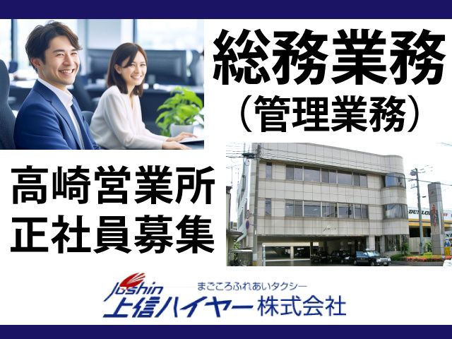 仕事内容 群馬県高崎市江木町にあります、 「上信ハイヤー株式会社 高崎営業所」より、 正社員、総務事務の募集を行います。 男女不問! 幅広い年代が活躍中 <募集職種> 正社員/総務業務(管理業務) 本社総務部として下記の業務を 担当していただきます。 将来的には総務部の管理者を 目指して頂ければと 思います。 ・総務部全体の管理業務 ・総務関係事務 ・帳票管理 ・電話応対 ・タクシー配車業務補助 ・その他付随する業務 業務には簡単なパソコンの使用があります。 (エクセル・ワード等) <未経験者・他業種からの転職OK!> タクシー業界の経験は初めて! そんな方もご安心ください。 しっかり先輩スタッフがフォローいたします。 業界デビューの方を手厚く応援いたしますので、 この機会にぜひチャレンジしてみてください。 ご応募お待ちしております。 管理業務やマネジメント業務の経験が無くてもOK! <長期安定のお仕事です> 当社は上信電鉄のタクシー事業を 昭和50年に事業継承し、 安心・安全を第一に信頼を 積み重ねております。 入社日は相談に応じます! 再雇用制度もあるので 安定して長くお仕事をしたい方は ぜひご応募くださいね。 <幅広く募集します!> 当社では現在幅広い年代の スタッフが在職中です。中でも 40代・50代・60歳以上の中高年、 ミドル・シニア世代が 男女問わず大活躍中です! 『説明会随時開催しています』 2月12日(木)午後 3時より 21日(土)午前10時より 3月12日(木)午後 3時より 21日(土)午前10時より 4月16日(木)午後 3時より 18日(土)午前10時より 5月14日(木)午後 3時より 23日(土)午前10時より 不安な事や分からない事など 随時説明会を開催していますので お気軽にお問い合わせください。