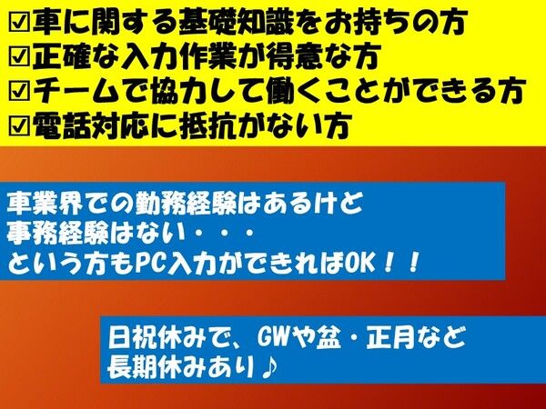 応募資格 ◇普通自動車免許 ◇PCでの入力作業のできる方 ◇車の整備に関する知識をお持ちの方や自動車関連の業務経験のある方は優遇