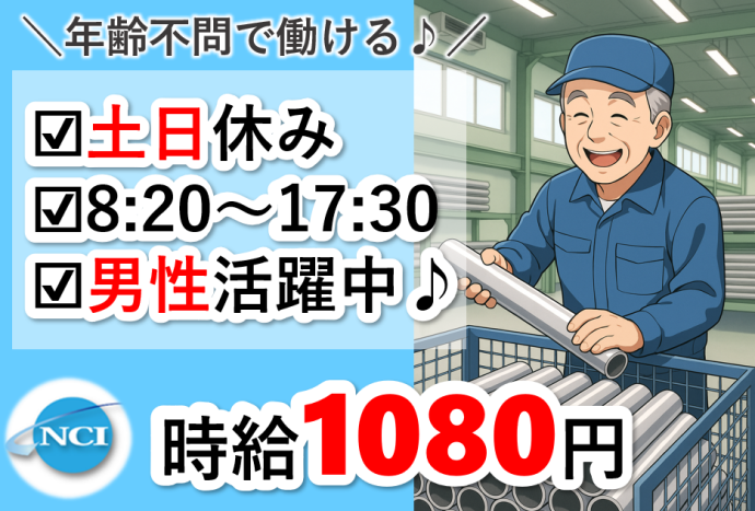 仕事内容 【業務内容】 アルミニウムパイプを 作っている会社での勤務になります ~主なお仕事の流れ~ 主にアルミニウムパイプを 運ぶ作業を担当してもらいます! ①自動機からカットされた アルミニウムパイプが出てきます。 ②アルミニウムパイプを カゴに入れていきます。 ③カゴがいっぱいになったら カゴを運びます。 ①~③の作業の繰り返しになります! ※基本的に立ち作業になります! ※カゴは20キロ程度になります ※もくもく作業が 好きな方にオススメです♪ 〇基本的にマシンから 出てきた製品を カゴに入れていくだけの 簡単もくもく作業! ほとんどの従業員さんが 製造経験未経験で スタートされています! 気軽に工場見学だけでも お気軽にご相談ください! ◇ここがポイント◇ ・事業好調により増員大募集! ・嬉しい土日休み! ・敷地内駐車場あり! ・制服貸与! 〇タイムスケジュール 【8:20】ラジオ体操 【8:30】午前の勤務開始! 【10:00】10分休憩 【10:10】勤務再開 【12:00】昼食 【12:50】午後の勤務開始! 【15:00】10分休憩 【15:10】勤務再開 【17:30】勤務終了♪退勤♪