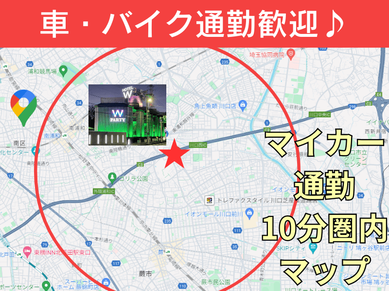 交通・アクセス 渋谷・新宿・池袋 都心より首都高・関越道・東北道・常磐道より東京外環の西川口IC降りてすぐ。 「武蔵野線南浦和駅」より車で5分・「京浜東北線蕨駅」より車で3分・Wグループ越谷店より車で20分