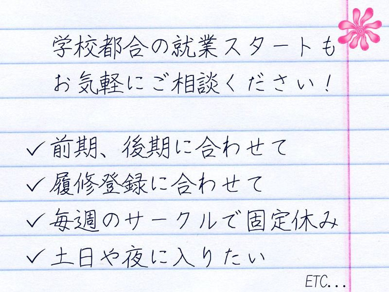 求めている人材 ◎履歴書不要! ◎スマホ面接可♪ ◎ラインで連絡OK ◎午後出勤OK!遅起き夜更かしできる ◎20:30まで勤務できる方積極採用中 必須条件:明るく挨拶できること 歓迎条件:やってみたいという気持ち ――怖くないカジュアルな面談1回のみ! 話しやすい面接官なので気軽に応募OK 〈おすすめ〉 ・穏やかな先輩が多く優しくしてもらえる♪ ・ゼミ・授業と両立したい方歓迎 ・就活中の収入確保にも◎ ・塾講などと掛け持ちも可能 〈歓迎〉 ・受かるバイトを探している方 ・ガクチカに活かしたい方 ・さまざまな経験を積みたい方 ・アパレルバイトに挑戦したい方 ・店長が若手、年が近いとうれしい方