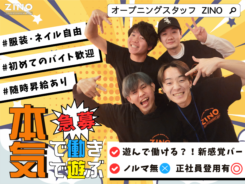 仕事内容 ✨ZINO 柏店(4/3OPEN予定)✨ オープニングスタッフ募集★ *「バイト」って、ただの時間潰しだと思ってた。* *だけどZINOに出会って、考えが変わった。* ただの飲み会?いや、違う。 ZINOは、エンタメが“仕事”になる場所。 ダーツやカラオケの盛り上がりをサポートしたり、 笑いのある空気作りをしたり。 気づけばお店全体が一体感に包まれる、 そんな時間を作る仕事です。 *【具体的なお仕事内容】* ✅ ダーツ・カラオケ・ゲームなどの“遊び提供” ✅ ドリンクやフードの提供 ✅ 開店準備や閉店作業(早番は準備メイン) 実際にご来店いただいたお客様からは、 「1時間のつもりが、気づいたら5時間もいた!」 「グラスが空く前に次のドリンクが届いて、笑いも止まらない」 「1人でも、友達とでも、大勢でも、居心地がよくて楽しい」 そんな声がよく届きます。 こんな空間を作れるのは、間違いなくスタッフの“気づき”と“ノリ”。 *「誰かを楽しませるのが好き」*なら、 すぐに馴染めること間違いなしです! “気づき”と“ノリ”で、夜を盛り上げる。 「また来たい」と思わせるのは、あなた次第です! ✨【お店の雰囲気はこちらから】✨ ▼TikTok → @zinoallstars ▼Instagram → @zino_recruit_ ※各店舗のインスタアカウントもあります! ⭐遊びが仕事に :ダーツ、ボードゲーム、カラオケ、シーシャ全部アリ! ⭐見た目自由 :服装・髪型・髪色・ネイル・ピアス・タトゥー全部OK! ⭐仲間ができる :終業後に一緒に遊んだり、飲んだり、ご飯行ったりも。 ⭐まかない付き&無料で系列店利用も可!