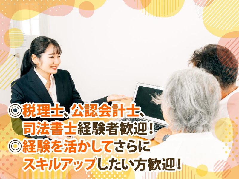 求めている人材 ◎経験者歓迎! ◎特別な資格は必要ありません ◎要普通自動車運転免許(AT限定可) ◎年齢不問 ◎学歴不問 =================== ◎税理士、公認会計士、司法書士経験者歓迎! ◎ブランクがあっても問題ありません!再スタートを応援します ◎経験を活かしてさらにスキルアップしたい方歓迎!
