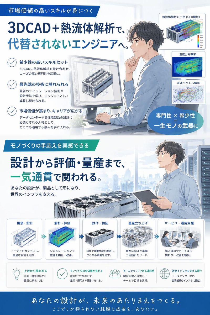 仕事内容 【年収730万~】あなたの「設計力」を、世界基準の報酬で評価する。 ■ この求人が、今のあなたに「刺さる」理由 「作業」ではなく「思考」の設計: 指示待ちのオペレーションではなく、顧客の要求から3Dモデリング、熱流体解析、構造解析を駆使して「最適解」を導き出す、設計者本来の業務です。 圧倒的な報酬設計: 時給3,150円〜4,100円。さらに残業手当は**「1.3倍(30%増)」**。設計会社やメーカーの正社員として年収500〜600万円で燻っている実力者なら、年収730万円~、熟練者なら更に上を確実に狙えます。 「熱設計」という一生モノの専門性: AI・クラウド時代のインフラである「ハイパースケールデータセンター」。その最重要課題である「熱」を制する技術は、エンジニアとしてこの先の優位性を約束します。 ■ 仕事内容:ヒートシンクの設計開発 ・北米の巨大データセンター事業者向け冷却製品の開発をお任せします。 ・上流工程: 3Dモデリング(Creo推奨)および熱流体・構造解析。 ・試作・評価: 原理試作の製造指示、実験室での評価・検証。 ・量産支援: 国内外の工場での量産立ち上げ支援(出張あり)。 グローバル対応: 技術レポート作成やメールでの海外連携(会話不要、読み書き中心)。 ■ ターゲットとなる方のイメージ 「描くだけ」から「考える設計」へ戻りたい方 ◇組図設計や製品改善の経験があるが、年収が頭打ちになっている方 ◇受託設計会社で、特定メーカーの「便利屋」扱いに疲れた方 ◇解析や評価まで含めた、手応えのあるモノづくりがしたい方 ■ 給与モデル(実働7.75h・月20日・残業30h想定) 時給3,150円 ⇒ 月収 61.1万円 / 年収 733万円 時給3,650円 ⇒ 月収 70.8万円 / 年収 850万円