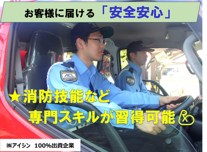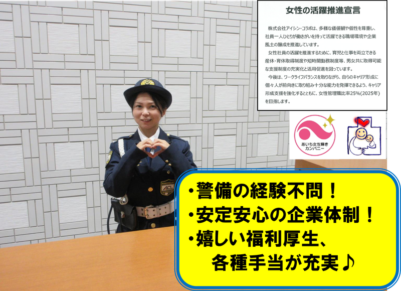 仕事内容 \\求人のPOINT// ✅年間休日170日! ✅年収560万円以上も可能! ✅未経験から正社員が目指せる♪ ✅上場企業グループ会社で安心◎ ✅充実した福利厚生あり✨ ⭐仕事内容  ̄ ̄ ̄ ̄ ̄ ̄ ̄ ̄ ̄ ̄ ̄ ̄ ̄ ̄ ̄ ̄ ̄ ̄ ̄ ̄ アイシン及び関係グループ会社の 事務所や工場での施設警備を行う 施設警備スタッフの募集です! 具体的には ・事務所・工場内の巡回警備 ・出入り口での来客対応や受付業務 ・防災・防犯機器の監視、点検 ・有事発生時の初動対応 などのお仕事をお願いします。 ⭐職場の雰囲気  ̄ ̄ ̄ ̄ ̄ ̄ ̄ ̄ ̄ ̄ ̄ ̄ ̄ ̄ ̄ ̄ ̄ ̄ ̄ ̄ 20代~40代が多数活躍中! 製造や飲食など、別の業種から転職し 始めた方も多数在籍しているので 未経験の方でも安心して働けます。 1つの職場は8~16名程度で編成。 部署ではメンバー同士の繋がりや チームワークを重視しています。 社内イベントにはご家族も一緒に参加可能! 家族との時間を大切にしながら 仕事を超えた交流も活発に行える 和気あいあいとした職場環境です。 ⭐正社員登用制度について  ̄ ̄ ̄ ̄ ̄ ̄ ̄ ̄ ̄ ̄ ̄ ̄ ̄ ̄ ̄ ̄ ̄ ̄ ̄ ̄ 入社時は契約社員での雇用となりますが 入社から4ヶ月後に正社員登用試験を 受けることができます。 この試験に合格すれば入社6ヶ月後から 正社員として働いていただけます。 試験の前には上司から手厚く指導して もらえるのでご安心ください。 試験合格率は95%以上! 正社員として安定して働きたい方や 腰をしっかり据えて長く働きたい方は ぜひご応募ください。 警備未経験からの挑戦も大歓迎です! ⭐安定企業&充実の福利厚生  ̄ ̄ ̄ ̄ ̄ ̄ ̄ ̄ ̄ ̄ ̄ ̄ ̄ ̄ ̄ ̄ ̄ ̄ ̄ ̄ 親会社である【株式会社アイシン】は 愛知県三河地方を代表する 自動車部品メーカーであり トヨタグループ主要13社の1つ。 そんな株式会社アイシンの 100%出資企業なので 安心・安定して長く勤めていただけます! 福利厚生もしっかりと整っており 交通費支給や各種休暇制度をはじめ、 財形貯蓄制度や資格取得支援、キャリア コンサルティング制度などもあるので 「将来を見据えて堅実に働きたい」 「スキルを身に着けて成長していきたい」 「キャリアアップを目指したい」 という方にもピッタリです! その他、寮・社宅代替手当も申請可能です。 ※規定条件あり