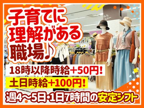 仕事内容 未経験歓迎◎家事の延長感覚で始められますよ!主婦(夫)のあなたにぴったりの職場です♪ ★週4日~×フルタイムでしっかり働けます! ★スタッフの声★ 「子どもが手を離れたタイミングで始めました!」 「フルタイムですが、急なお休みにも理解がある職場なので、 家事との両立もできて働きやすいです!」 「昔、飲食店でホールをしていた経験はありましたが、 アパレル特有の「声かけ」が苦手で不安でした。 でもここでは無理な接客はなく、お会計や品出しなど、 飲食店と似た感覚で働けて安心です。すぐに馴染めました!」 お仕事内容は… ・レジ ・売場管理 ・品出し ・清掃 などの軽作業をお任せ。 まずはレジ操作を覚えて、衣類をたたむ、売り場を整理する等、できることから始めていきましょう◎ 家事の延長感覚で気軽に始められます♪ 積極的なお声がけなし!サポート体制ばっちり! パレットは幅広い年齢層の衣料品や 雑貨を取り扱う家族向けのお店♪ 未経験でも安心してスタートできる アパレル販売スタッフです! 主婦(夫)、子育て中の方、40代・50代中高年の方まで幅広く活躍中! 今いるスタッフの半数以上は販売、 接客業が未経験でした。 新しいお仕事を始める不安な気持ちが よく分かるので、スタッフみんなで 精一杯サポートできたらと思います! パレットはこんなお店です♪ お子様の成長を彩る、サイズもデザインも 豊富な子供服のラインナップ! 新生児のベビー服から、人気キャラクター のプリントTシャツやコラボアイテムなどの キッズ服、通園通学に便利なカジュアル ウェアや丈夫な保育園着、特別な日の ためのフォーマルなワンピースなど、 シーンに合わせてお選びいただけます。 もちろん大人向けや親子で着れる 着心地の良いパジャマ・靴下や普段着・ 定番のスーツまで、幅広くご用意して おります。 他にも、キャラクターグッズや雑貨も充実! 人気のアニメやゲームのキャラクター グッズも多数取り扱っています。 ぬいぐるみやおもちゃなど、お子様の心を わくわくさせるアイテムが盛りだくさんです。 ギフト包装をお願いされることもあり、 可愛いラッピングも学べます!