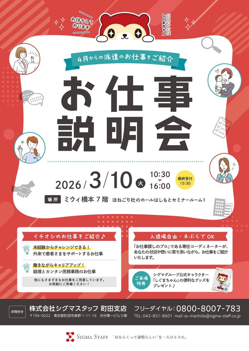 選考プロセス 【カンタン登録】 (1)応募後、弊社からお電話・ メール・SMSにてご連絡! (2)事前WEB登録 弊社からご面談日程調整のご案内を お送りいたしますのでご確認ください。 (3)ご面談を実施 来社またはお電話にて詳しい求人のご案内。 (4)お仕事開始!就業後もフォロー! ▼問い合わせ先はコチラ!▼ 株式会社シグマスタッフ 町田支店 住所:東京都町田市森野1-11-16 渋谷第一ビル5階 電話番号:0800-800-7783 営業時間:9:00~17:30時(土日祝休み)