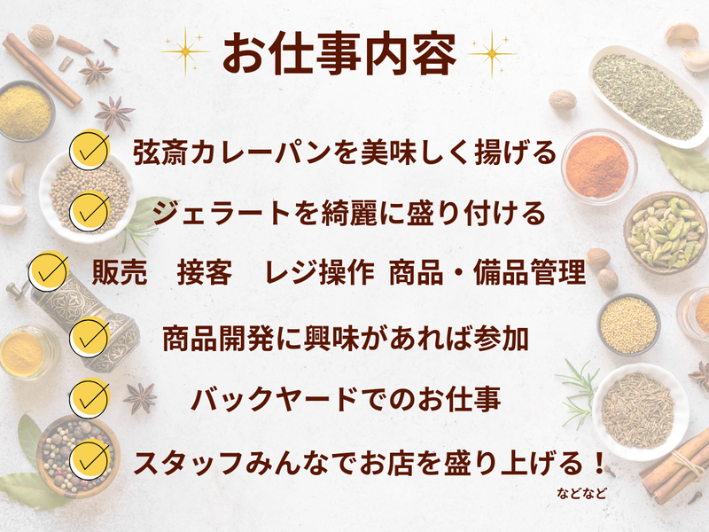仕事内容 ୨୧┈┈┈┈┈┈┈┈┈┈┈┈୨୧ 大人気!鎌倉・小町通りにある スパイスがコンセプトの ジェラートとカレーパンショップを 一緒に創りませんか? ୨୧┈┈┈┈┈┈┈┈┈┈┈┈୨୧ あなたにお任せしたいのは、 ただの「作業」じゃありません。 訪れる人の心に残る ”特別な時間”を演出すること。 ❏ スパイス香る、パン&ジェラート作り アツアツのフライヤーから立ち上る 「弦斎カレーパン」の香ばしい匂い。 カラフルなジェラートをイタリアの製法で カップに盛り付けるワクワク感。 簡単な調理補助からスタート! あなたの作った一品が、 誰かの「おいしい!」に変わる瞬間は きっとクセになりますよ♪ ❏ 商品開発 自分の開発した商品を販売してみませんか? ジェラートも季節や神奈川・鎌倉らしい ものを開発しています! ❏ 心を込めた、おもてなし 「どれがオススメですか?」 そんなお客様との会話も楽しみの一つ。 あなたの笑顔と言葉で、 商品の魅力をもっと伝えてください。 レジの操作も丁寧に教えるので 未経験でも心配いりません◎ ❏ お店のファンを増やす、SNS発信 「今日のジェラートはこんな感じ!」 「カレーパン、揚がりました!」 あなたのセンスで、お店の魅力を 世界中に発信してください! 写真の撮り方、文章の書き方… 得意なことを活かせるチャンスです。 働いているスタッフは全員女性スタッフ 大学生や主婦さんです! 大変なこともあるかもしれないけど、 それ以上に「楽しい!」が溢れるお店を 一緒につくっていきましょう! ⭐こんな想いを持つ方を待っています⭐ 「どうせ働くなら、楽しまなきゃ損!」 「鎌倉が大好き!この街を盛り上げたい」 「新しいことに挑戦して自分を試したい」 「SNSで『いいね』をもらうのが好き」 「人と話したり、喜ばせるのが好き」 ひとつでも当てはまったら、 あなたはもう、私たちの仲間です! 特別な経験やスキルは必要ありません。 「やってみたい!」という その気持ちが、最高の資格です。