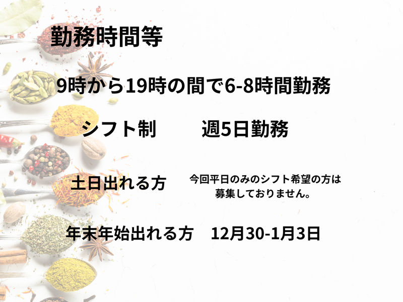 勤務時間詳細 勤務時間:8時-19時 ※1日6時間~、週5日~OK!