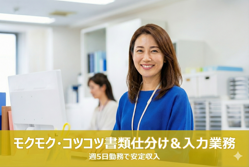 求めている人材 ・書類の仕分け、基本的なデータ入力が可能な方 ・ブランクのある方、社会復帰を目指す方も歓迎します ・業務未経験だがチャレンジしてみたい方もOK <こんな方にオススメです!> ・事務、バックオフィス業務経験者 ・責任感を持って取り組める方 ・コツコツもくもくと取り組める方
