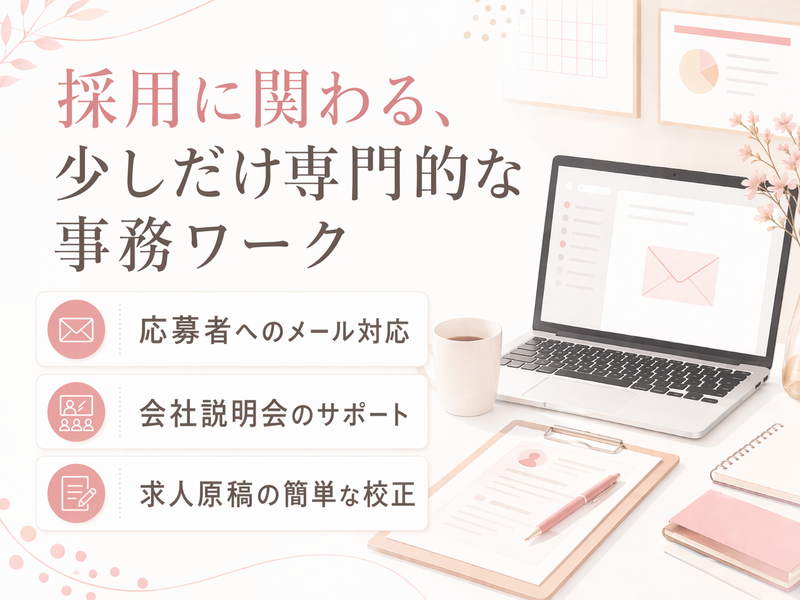 求めている人材 <未経験者歓迎> ⏩基本的なPC操作ができる方 ※人事業務・サポート業務に 興味のある方大歓迎 【具体的には】 <PC操作について> ✅Word、Excel、PowerPointができる方 ✅メールやDMの文章作成が得意な方 に期待しています。 <以下のような方は大歓迎です> ・採用部門または人材業界で勤務経験ある方 ・リクナビ等や採用サイトの 管理・操作経験ある方 ・営業経験など人と接する仕事経験がある方 (業界や経験年数は不問) ・オンラインツールの操作経験がある方 ✨正確な実務はもちろん、 臨機応変な対応のできる方 ==================== ✋社員にインタビュー!✋ ―――――――――――― 「採用部門または人材業界で勤務経験の ある方ならピンとくる仕事ばかりだと 思いますが、業界経験の無い方も ご安心ください。 ちょっと専門的な業種ではありますが、 お客様の代わりに『人事採用担当者』として 働くのはやりがいのある仕事だと思います。 質問があればすぐに先輩がお応えします。」 『オフィスワークがいいけど、 経験を活かしたお仕事がしたい!』 『ちょっと専門的なほうが面白そう!』 ▼ 「そんな志向の方にピッタリのお仕事です! このお仕事は1日で完結するものではなく、 1社の法人様につき数週間から長いもので 数ヶ月にわたりますので、時間をかけて 信頼を築き上げていく喜びがありますよ。」