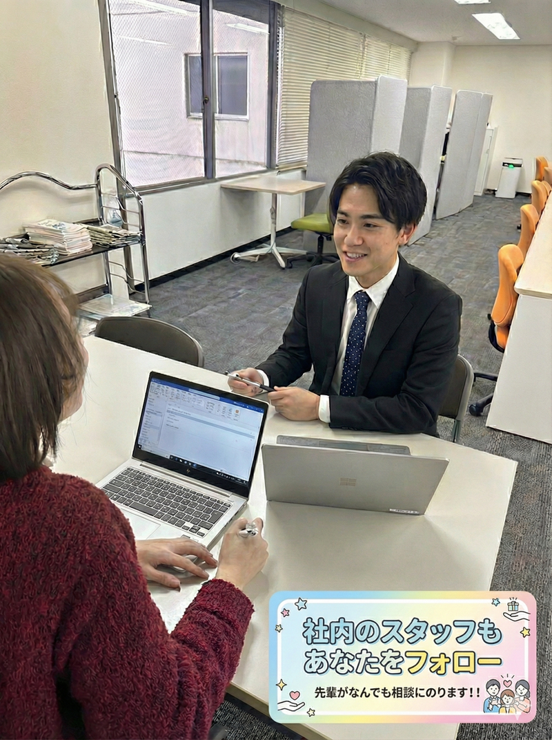 選考プロセス ▼書類選考の上、ご連絡します。 通過者には面接日時をお知らせします。 ▼一次・二次面接 Zoomでの面接も可能です。 ▼内定 ※応募に関する秘密は厳守します。 ※入社時期も相談に応じます。 ■20・30代メンバー中心に活躍中! フリーアドレスという事もあり、 チームマネージャーの付近に座りつつも チームメンバー間の距離は近く、 チームワーク抜群。 分からない事や困った事があれば 近くの先輩にすぐ質問できる環境! 人間性を大切にする社風で 外部研修への参加など 成長を積極的に支援します。