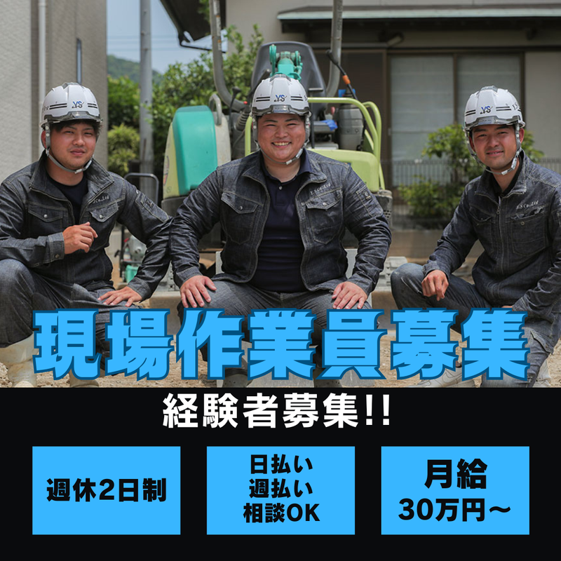 仕事内容 \ ✨その汗と技術、正当に評価します✨/  ̄ ̄ ̄ ̄ ̄ ̄ ̄ ̄ ̄ ̄ ̄ ̄ ̄ ̄ ̄ ̄ ̄ ̄ ̄ ̄ 「雨で現場が休みになり、給料が減った…」 「いつまでこの働き方を続けられるだろうか…」 現場で汗を流すあなたが、そんな不安を 抱える必要は、もうありません。 当社では、現場の仲間こそが会社の財産。 だから、どこよりも大切にします。 ⭐約束①【安定】月給25万円以上を保証 天候に左右されない月給制。賞与も年2回。 日払いや週払いの相談も可能です。 ⭐約束②【休息】残業なし&完全週休2日制 休憩はたっぷり90分 17時にはきっちり終了 体をしっかり休め、 家族時間や自分時間も楽しめます。 ⭐約束③【未来】作業員で、終わらせない 施工管理へのキャリアアップを全力で応援。 資格取得の費用は、会社が負担します。 【会社について】 福岡県を拠点に、一般土木一式工事業・造成工事業・建築一式工事業・解体工事業・一般外構・エクステリア工事業から太陽光設置工事業まで幅広く事業を行っています。 今回は業績好調に伴い求人募集します! ◆◆ 具体的な現場作業 ◆◆ ・造成工事や土木一式工事の現場施工 ・ブロック積み、資材の積み下ろし ・重機・建設機械の補助作業 ・資材の運搬 など まずはあなたの得意な作業からお任せします。 将来的には、施工管理の補助として 簡単な書類作成や写真管理などにも チャレンジすることが可能です! ◆◆ 担当する現場について ◆◆ 造成工事、外構・エクステリア工事を中心に 一般住宅から公共工事まで多岐にわたります。 現場は福岡県内がメインで、転勤はありません。直行直帰も可能で、効率的に働けます。 ~~~ 1日の流れ(例)~~~ 08:00 / 現場朝礼、作業開始 ▼ 10:00 / 休憩(15分) ▼ 12:00 / 昼休憩(60分) ▼ 15:00 / 休憩(15分) ▼ 16:30 / 現場の片付け、明日の準備 ▼ 17:00 / 退社「お疲れ様でした!」 ※残業はほとんどなく、17時には退社。 家族との夕食にも、余裕で間に合います! ★★こんな社長が舵を切ってます★★ 社長を知る他の経営者からは 「業界の風雲児」なんて言われるほど、 経営力や人材マネジメント力に長けた社長です。 そんな社長は、仲間にはこの会社を通して 幸せになってほしいという想いがあるので 社員のやりがいや生活を第一に考えています! 土木だけでなく建築関係の知識も有しているため、幅広い工事を請け負っています。