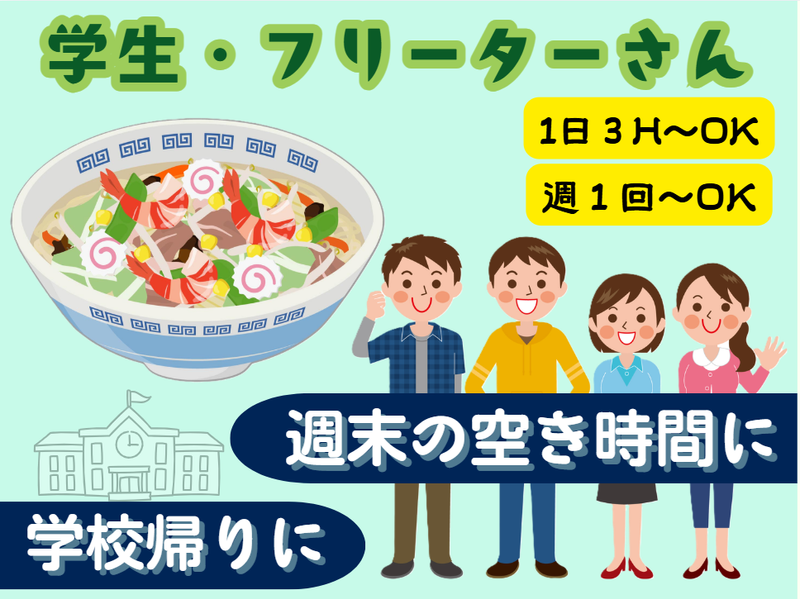 仕事内容 接客・レジ・キッチンのお仕事です。 未経験から始めた仲間ばかり! タッチパネル式でどなたでも簡単に 覚えられるので安心してくださいね! キッチンはマニュアルに沿った 簡単な作業だから、どなたでもすぐに 慣れて頂けますのでご安心下さい。 学校やWワークなど諸事情で 「キッチンしか入れない」 逆に「手があれやすいからホールだけで」 なんて方も柔軟に対応します◎ 気さくで優しい仲間ばかりで、 毎日わいわい楽しく働いています。 1日3H~の超時短勤務もOK 週1~OK! スケジュールも立てやすい! 学校行事や、試験休みなど 何でも相談してくださいね。 期間の相談もお気軽に! その後のシフトも相談OK