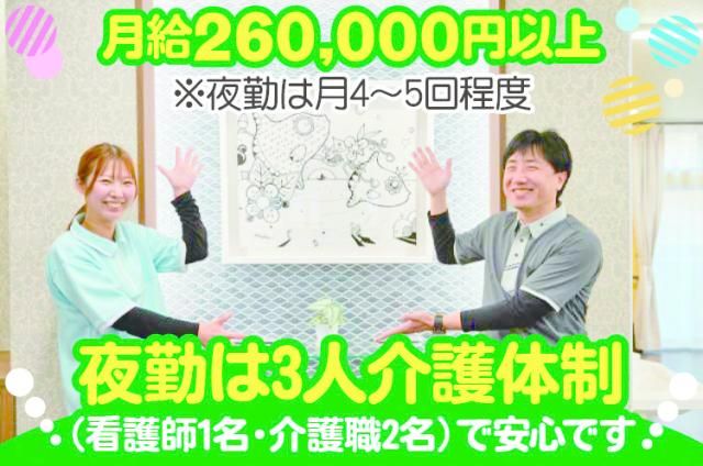 勤務曜日・時間 〈日勤〉 7:00~16:00 9:00~18:00 11:00~20:00 ※休憩60分 〈夜勤〉 17:00~翌9:00 ※休憩120分 ★夜勤は月4日~5日程度を予定しています 夜勤は3人介護体制(看護師1名・介護職2名)で安心です 家事・子育てとの両立も応援します! ・お子さんの学校行事等には配慮可能 ・ご家族の急な発熱などのシフト変更も皆でフォローします ・有給休暇取得もし易い環境です