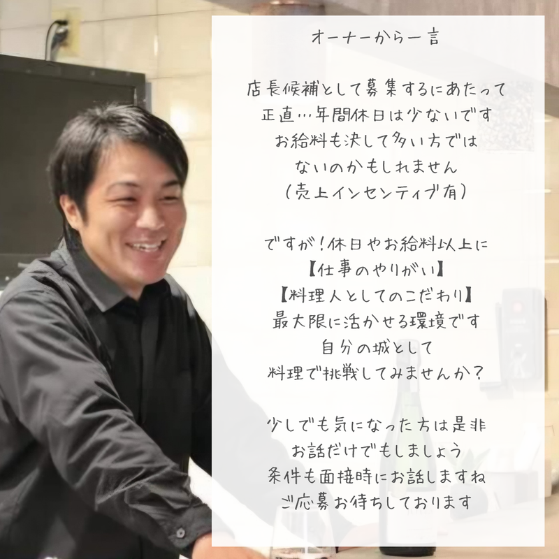 仕事内容 【新規OPEN 和食×国産ワインのお店 店長候補】 「もっと料理を楽しみたかった。もっと自分の時間も欲しかった。」 そんな想いを持つ料理人の方へ。 長崎駅エリアに新しくオープンする、和食と国産ワインの隠れ家和バル。 カウンターわずか6席。バタバタと忙しさに追われるのではなく、 お客様一人ひとりと会話を楽しみながら、一皿に集中できる環境を整えました。 【店長として、あなたの「こだわり」を一任します】 一任と聞くと全て丸投げの激務なのではないか?と思うかもしれません。 店長候補として勤務して頂きますが・・・ いきなり1人で任せることはありません しっかりと研修を行い、段階的にお店をお任せしていきます。 「いきなり店長は不安…」という方でも大丈夫です。 ご安心下さい。 店長候補として 仕入れからメニュー開発まで、店舗運営の全般をあなたの裁量でお任せします。 「今日は良い地魚が入ったから、あえてワインに合うこの味付けで」 といった、料理人としての直感や遊び心を大切にできる環境です。 「自由度が高い」ではなく「一国一城の主」としてお任せしたいと考えています。 15時にゆっくり出社し、その日に仕入れに合わせてメニュー構成 22時には閉店し自分の時間をしっかり確保して頂きます。 「夜営業の飲食店は帰りが遅い」という常識を変えて クリエイティブな仕事に集中出来る環境を整えております。 <具体的には> ・その日に仕入れた旬の食材、長崎の地魚を活かしたメニューの考案 ・国産ワインとのペアリング考案・メニュー作り ※仕入れはご自身のルートがある場合は優先します。無い場合は全てをお教えします。 ・仕入れ、在庫管理、SNSでの発信 ・6席のお客様への接客・サービス (ワイン・新作和食の試飲食会などのイベント開催も自由に設定出来ます) ※SNSなどを活用した店舗ブランディングと集客は 様々なアイディアを採用していきます あなたの経験と感性を最大限にぶつけて下さい。 (SNSが苦手な方でも丁寧に教えます) <ターゲット層> 40代のキャリア女性を中心とした、落ち着いてお酒と食事を楽しみたい大人のお客様がメインです。 騒がしい居酒屋ではなく、質の高い時間とサービスを提供することを目指しています。 【このお店で働くポイント!】 ・飲食店では珍しい「日祝休み」: 友人や家族と予定を合わせやすく、プライベートを犠牲にしません。 休日出勤は一切ありません。 ※年末年始は連休になります。 ・15時出社で午前中を自由に: 満員電車とは無縁。役所や銀行の用事も、趣味の時間も、たっぷり確保できます。 ・残業ほぼなし、22時閉店: 夜の飲食店は帰るのが遅い、そんな常識は非常識に変えていきます! 22時閉店・遅くても23時には完全撤収して頂きます 家族や友人や恋人との時間も大切にして下さい。 ・圧倒的な裁量権: 「自分の店」のような感覚で、得意な料理やアイデアをどんどん形にしてください。 (詳しくは面接時にお話しします) ※基本は1人営業ですが、6席のため無理のない オペレーションです 仕込み・営業ともに余裕を持って回せる設計にしています 忙しさに追われるというより 「お客様としっかり向き合える仕事」です。 営業に慣れてきてから段階的にステップアップしていきましょう。 コンセプトは居酒屋よりちょっと贅沢な和バル「和食×国産ワイン」 賑やかな駅前から少し離れた場所に佇む、 カウンターわずか6席の小さなお店です「6席だからこそ出来る」 近い距離でお客様の喜びを体感出来ます。 こだわりの国産ワイン、そしてそれらに寄り添う 和食を提供する「大人の隠れ家」です。 「1日の流れ」 例: 15:00 出勤 15:00~17:00(仕込み・営業準備) 17:00~22:00(営業) (ラストオーダー21:30) 22:00~閉店作業(終わり次第退社) (6席なので一人ひとりのお客様と会話しながら調理・提供) ※事務作業は最小限で、料理に集中できる環境です。 ※ 旬の地魚を使ったお造りや、国産ワインに合う創作料理など、あなたの得意料理をメニューに反映できます。 ※料理の提供方法もワンオペで無理のない方法で行います。(おばんざいなど) ※基本ワンオペ業務です この仕事のリアルな魅力 ・大箱のようにバタバタ走り回ることはありません ・お客様と会話しながら落ち着いて働けます ・自分の料理やお酒の提案がそのまま売上に直結します ・「自分の店みたいに働きたい人」には最高の環境です 【オーナーからの一言】 「料理を作るのは好きだけど、今の環境では忙しすぎて一皿に集中できない」 「自分のアイデアを形にしたいけれど、マニュアルに縛られている」 もしあなたがそんな風に感じているなら、ぜひ一度お話ししませんか? 今回オープンするお店は、わずか6席。 私が大切にしたいのは、回転率を追い求めることではなく、お客様一人ひとりが 「今日の料理とワイン、最高だったね」と笑顔で 帰ってくださる、そんな質の高い時間です。 私は、店長となる方に「自分の店」のような感覚で腕を振るっ
