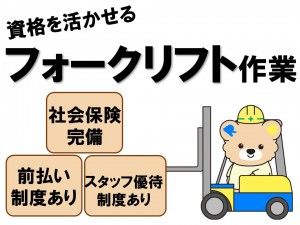 応募資格 <必須資格> 中型自動車種運転免許 フォークリフト免許 トラックドライバー経験 カウンターフォーク経験 <歓迎条件> ・トラックドライバー経験者活躍中 ・カウンターフォーク経験者活躍中 ・製造経験あれば尚可 ・学歴不問(中卒/高卒/大卒OK) ・若手世代/ミドル世代方が活躍 ・ブランクOK