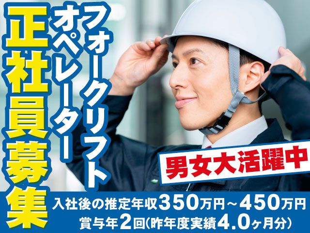 資格・経験 ・44歳以下(省令3号のイ) ・要フォークリフト免許 ・普通自動車免許(AT限定可) ・男女歓迎 <こんな方お待ちしています> ・仕事を通してフォークの運転や 技術を向上させたい方 ・フォークリフト経験を活かしたい ・異業種からの転職をお考えの方 ・正社員として安定して働きたい方 ・新しい環境でスタートしたい方 人柄重視で積極採用しますのでお気軽にご応募ください! 【以下のご経験をお持ちの方もお待ちしております!】 フォーク作業 / フォークリフトオペレーター 工場内フォークリフト作業/倉庫内作業