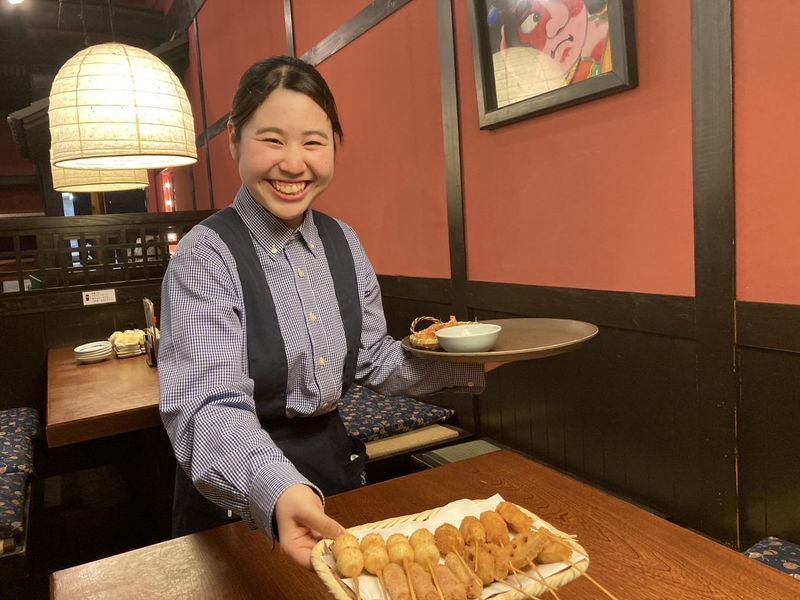 仕事内容 \アピールポイント/ ✅初アルバイト大歓迎! ✅駅チカで通いやすい! ✅週2日~、1日3時間~OK! ✅絶品まかないつき! ✅1週間前の希望シフト制! ✅高校生OK(21時半までの勤務) ★☆━━━━━━━━━━━━━━━ <新スタッフ大募集!> バイトデビュー大歓迎! 新しい環境で、新しいバイトを始めよう! ━━━━━━━━━━━━━━━☆★ 串かつ・焼き鳥の和食ダイニング 『串八』のホールスタッフを大募集! <具体的な仕事内容> ・お客様のご案内 ・オーダー取り ・料理や飲み物の提供 ・テーブルの片付けや清掃 ・お会計(自動釣り銭機導入♪) 入社してすぐは お店の雰囲気に慣れてもらうところから! 優しい先輩が丁寧にお伝えするので 未経験でも安心! 初めての方も5日くらいで慣れてきますよ♪ 働き出して1ヶ月ぐらいで、 面談の機会も設けています! 困ったことはそこで解消していきましょう♪ / 未経験でも活躍できる理由✨ \ ①丁寧な研修制度あり!  ̄ ̄ ̄ ̄ ̄ ̄ ̄ ̄ ̄ ̄ ̄ 入社初日はお店の雰囲気に慣れることから! 年の近いアルバイトの先輩が 丁寧にサポートします◎ 研修動画を見ていただきますので 理解が深まります! ②段階的にスキルアップ!  ̄ ̄ ̄ ̄ ̄ ̄ ̄ ̄ ̄ ̄ ̄ ̄ 最初は簡単な作業からお任せします。 できることが増えていく やりがいを感じられます♪ 独り立ちするまでは トレーナーさんがつきます。 ③アットホームな職場環境!  ̄ ̄ ̄ ̄ ̄ ̄ ̄ ̄ ̄ ̄ ̄ ̄ ̄ 大学生スタッフが9割を占める 和気あいあいとした職場です。 / 「串八」バイトのオススメポイント! \ ✨働きやすさ抜群のシフト制  ̄ ̄ ̄ ̄ ̄ ̄ ̄ ̄ ̄ ̄ ̄ ̄ ̄ ̄ シフトは1週間ごとの提出です。 希望シフトは【 99% 】通ります☆ 「学校が休みの日に働きたい」 「テスト前だから早めに上がりたい」 「掛け持ち先と両立させたい」 など、柔軟に対応可能です! ✨プライベートも大切に!  ̄ ̄ ̄ ̄ ̄ ̄ ̄ ̄ ̄ ̄ ̄ ̄ まとまった休暇も相談OK! テスト1週間前や実習、帰省なども 気軽に相談してください! バイトも頑張りながら、 友達や家族と旅行へ行ったり ライブや推し活など プライベートも沢山楽しめます! ✨お仕事以外の魅力も!  ̄ ̄ ̄ ̄ ̄ ̄ ̄ ̄ ̄ ̄ ̄ ̄ ✅絶品まかないが食べられる! ✅BBQ・新人歓迎会・忘年会などイベント多数! ✅年1回、忘年会でのアルバイト表彰制度あり!