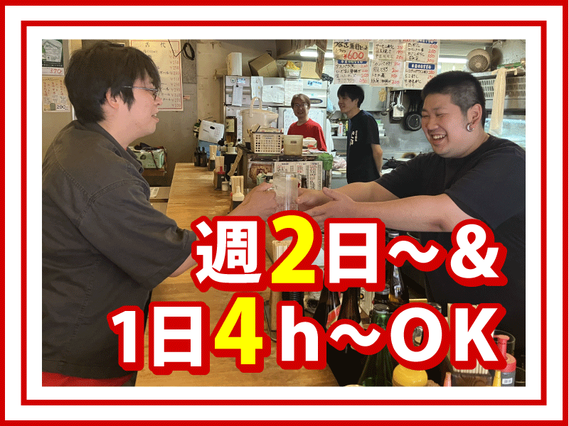 仕事内容 \\*地元の方の”いこい”の場*// ✅夕方~夜の短時間だけでOK! ✅週2日~無理なく勤務可能◎ ✅地元の方・ご近所さん多数活躍中♪ 50代・60代活躍中! 昔ながらの居酒屋さんでの ホール&キッチンスタッフ募集です✨ 《子育てが落ち着いた主婦さんも在籍》 ●ドリンク作り ●会計 ●おつまみ提供(簡単な盛付) ●喫煙エリアの清掃 等 ※ランチ帯もガッツリ料理はありません! 《こんなお客様がいらっしゃいます!》 ●「夜勤明けの楽しみに」と早朝に 立ち寄ってくださる警備員さん ●「リタイア後の日々に潤いを」と しっぽり昼飲み派のシニアさん 等 ⭐”どこか懐かしい雰囲気”が自慢⭐  ̄ ̄ ̄ ̄ ̄ ̄ ̄ ̄ ̄ ̄ ̄ ̄ ̄ ̄ ̄ ̄ 下町の雰囲気を残した居酒屋なので、 お客様との距離も近め! オーダーはお客様が紙に書いたものを 合っているか確認していきます。 注文を受けたお酒やおつまみを作る 作業もお任せすることがあります! 最初はメニューや金額を覚えるのが 大変に感じるかもしれませんが、 少しずつ慣れていけばOK! 元気で明るいベテランstaffを筆頭に、 楽しい雰囲気を作っていきましょう♪ ⭐深夜までの営業はありません⭐  ̄ ̄ ̄ ̄ ̄ ̄ ̄ ̄ ̄ ̄ ̄ ̄ ̄ ̄ ̄ ̄ 営業そのものが22:00までなので、 私生活と両立しながら勤務可能◎ 終電を気にせずラストまで働けます! 「家事と両立してお小遣い稼ぎしたい」 「生活のためにしっかり稼ぎたい」 等といった働き方も大歓迎です♪