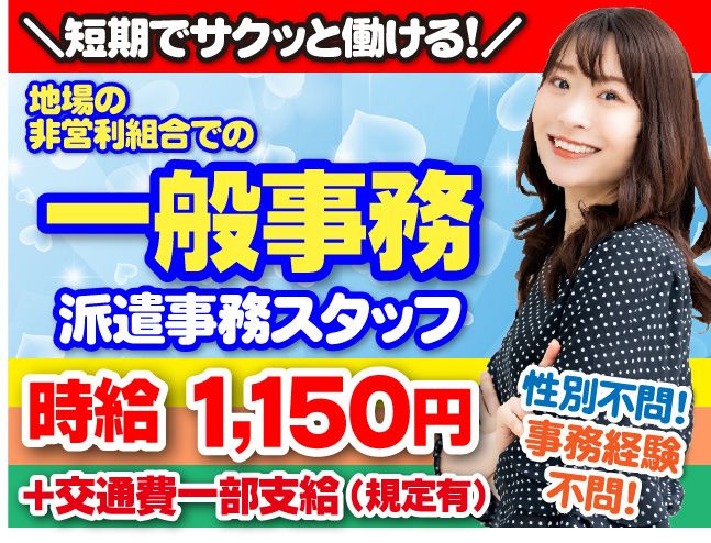 仕事内容 \短期でサクッと働ける!派遣のお仕事/ プライベートと両立しやすい【一般事務スタッフ】募集 【久留米市/派遣スタッフ募集】ブランクOK・主婦(夫)歓迎◎ 残業ほぼなしで家庭や趣味の予定も大切にできる、短期派遣のお仕事です。 シフト制だから柔軟な働き方ができ、家事やお子さんの予定とも両立しやすい環境です! ▶難しいスキル不要!カンタンな入力作業が中心なので安心です。 \ここがポイント/ ◎ 短期でサクッと働ける派遣のお仕事(3ヶ月程度/延長の可能性あり) ◎ 時給1,150円!短期でもしっかり収入◎ ◎ 残業ほぼなし!定時17:00退勤で家庭やプライベートと両立可能 ◎ シフト制週休2日!事前相談でお休みも柔軟に調整できます ◎ マイカー通勤OK&無料駐車場あり 仕事内容//// \性別不問!事務経験不問!/ 地場の非営利組合で、一般事務業務全般をお任せします。 家庭と両立しながら無理なく働きたい方にピッタリ! 主な内容 ・専用システムへのデータ入力 ・伝票発行 ・検品業務(箱の数のチェックのみ!) ・来客・電話応対、庶務など ここで働くメリット//// ◎ 欠員募集なので、即日スタートが可能! ◎ 短期だから、次の仕事や予定までのつなぎとして働きたい方に最適! ◎ シフト制だから、平日のお休みも楽しめます。 ◎ オフィスカジュアルでの勤務。 応募資格//// 《対 象》 ・性別や事務経験不問(ブランクOK、主婦/夫歓迎) ・PCでの入力作業が可能な方 《歓 迎》 ・一般事務や庶務経験がある方 ・テキパキと作業を進めるのが得意な方 おすすめポイント//// ◇ 短期派遣!最短3ヶ月程度の予定でサクッと働ける(状況により更新・延長の可能性有) ◇ 時給1,150円!短期でもしっかり収入が得られます ◇ 残業ほぼなし!お子さんのお迎えや夕飯の支度にも間に合います ◇ シフト制週休2日!土日祝の固定休みは相談不可ですが、事前に相談すればお休み 可能なので、ご家庭のイベントや予定に合わせて柔軟に調整しやすい! ◇ ロッカー・駐車場完備でマイカー通勤OK! ー//ー//ー//ー//ー//ー//ー//ー//ー//ー//ー//ー//ー//ー//ー//ー//ー//ー//ー//ー//ー//ー// 勤務地:福岡県久留米市 職 種:一般事務 期 間:即日から3ヶ月程度の予定(状況により更新・延長の可能性有) 給 与:時給:1,150円 + 交通費一部支給(規定有) 時 間:8:45 ~ 17:00 (実働7時間15分、休憩1時間) 休 日:シフト制週休2日(年末年始休み有) ー//ー//ー//ー//ー//ー//ー//ー//ー//ー//ー//ー//ー//ー//ー//ー//ー//ー//ー//ー//ー//ー// 知っておいてほしいこと//// 社則により、ヘアカラーは7号迄の規則があります。 土日祝の固定休みは相談不可ですが、予定があれば事前にご相談ください。 ◇ 短期間で次のステップを考えたい方や、家の用事・趣味の予定を優先したい方に 柔軟な働き方ができます! 少しでも気になった方は、ぜひお気軽にお問い合わせください! お仕事No.k38199