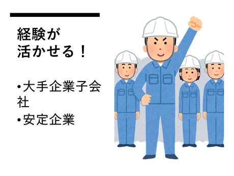 仕事内容 ~募集のポイント~ ★将来のリーダー候補 ★完全週休2日(土日) ★残業月平均20h!ワークライフバランス充実 ★残業は100%手当支給 ★賞与4.2ヶ月(昨年度実績) ★大手グループで安定・安心 ショベルカーやクレーン車などの建設機械や産業機械、プラントなど 世界中のインフラ整備産業の発展に貢献しています。 【具体的な仕事内容】 必要な長さに切ったホースの両端に金具を組み合わせる仕事です。 ・ホースと金具を機械でしめる工程 ・ホースと検査機器をつないで耐圧チェックを行う工程 ・製品の外観チェック~出荷の手配 すべての業務を習得の上、管理者としてラインの管理・指導に従事いただきたいと思います。 【入社後の流れ】 <研修> 就業規則や各種規程の説明、安全・品質の教育を実施します。 <配属> 入社後は、少しずつ作業工程ごとの技能を習得いただき、 将来的にはリーダーとして活躍していただくことを期待します。 わからないことは先輩にいつでも聞ける環境です。 【求める人物像】 ・製造職でリーダーを目指したい方 ・業務に意欲的に取り組むことができる方 ・チームで協力して製品を製造するため、協力的でコミュニケーションを自ら取れる方 ・製造経験がなくても、管理業務経験がある方は優遇します マネジメントに必要な研修は入社してから受講していただきます。 業務習熟までしっかりサポートします。 【こんな方が活躍しています】 ・製造現場で長期に活躍したい方 ・チームワークを大切にする方 ・周囲とのコミュニケーションを大事にする方 派遣社員・有期社員・正社員含めて全員で35名程度の事業所です。 当社でキャリア&スキルアップしませんか? お問い合わせのみでもOK!ご連絡をお待ちしています。