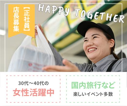 仕事内容 【手づくり・作りたて】にこだわるお弁当店の運営をお願いします 私たちのお弁当の特徴は 「手づくり」・「つくりたて」に こだわっている点。工場で製造され 棚に並んでいるものとはひと味違う、 温もりあるお弁当を提供します。 そのお店の店長として 店舗運営をお任せします。 基本業務(調理・接客)に加え、 管理業務(仕入れ発注・シフト編成・ メンバーの教育など)を 担当していただきます。 【女性社員比率75%以上】30~40代の女性が活躍中です 創業期から変わらず女性が活躍する 企業です。また、直営店ですから店舗間の 仲の良さも特徴です。仕事で困ったことは もちろん、いろいろなことを相談し 助け合える仲間がいますので、 安心してスタートしていただけます。 【ノルマなし・インセンティブあり】意欲次第でステップアップも可能です 直営店ならではの安定した環境のもと、 店長としてじっくり働くことができます。 売上に対するノルマはありませんが、 目標達成度に応じたインセンティブは あります。多店舗展開しているので、 新店を開くことやマネージャへ ステップアップして複数店舗の経営指導に あたることにもチャレンジできます。 【楽しく働く】国内旅行や季節の行事など♪楽しむイベントもりだくさん 当社は「楽しむ」ことを一番大切に しています。仕事を楽しむことはもちろん お月見会や新年会などの季節の催しに加え 毎年5月にバス旅行(飛騨高山、 横浜、幕張etc.)。年間を通して、 様々なイベントを開催しています。 【直営だから安心】創業40年・直営70店舗以上展開の安定企業です。 「HAPPY TOGETHER」を社是に掲げ、 お客様、お取引先、従業員などすべての 人たちが幸せになる店づくりを目指す当社。 多店舗展開していますが、 フランチャイズは1店舗のみ。 直営店ならではの風通しの良さと、 雇用の安定性が大きな特長です。 「地元で腰を落ち着けて働きたい」 という方、ぜひ当社で 長期安定を叶えませんか?