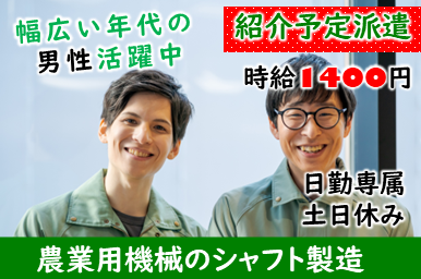 仕事内容 \とっても簡単/機械にセットしてポン!短期間で覚えてすぐ慣れることのできるお仕事です。【紹介予定派遣】6ヵ月以内に正社員雇用予定◇やる気を持って業務に取り組める方であれば経験・資格問わず! <仕事内容> ≪農業機械部品の製造≫ 農業機械等に使用されるシャフト製造のお仕事! 旋盤や研磨機に材料をセットするだけ。 材料をセット→スタートボタンをポチ!→出来上がった製品の検査というような流れのお仕事です。 立ち作業でのお仕事です。 重量物を扱う(15㎏以上)可能性がございます。 個人作業となります。 《環境》 男性が多い職場です。 CDP派遣スタッフが在籍中です。 アピールポイント <仕事内容> ≪農業機械部品の製造≫ 農業機械等に使用されるシャフト製造のお仕事! 旋盤や研磨機に材料をセットするだけ。 材料をセット→スタートボタンをポチ!→出来上がった製品の検査というような流れのお仕事です。 立ち作業でのお仕事です。 重量物を扱う(15㎏以上)可能性がございます。 個人作業となります。 《環境》 男性が多い職場です。 CDP派遣スタッフが在籍中です。 \充実した福利厚生/ ◎社会保険・雇用保険完備 ◎有給休暇有(6ヶ月経過後、10日付与)※規定あり ◎残業手当 ◎交通費支給(規定内) ◎確定拠出年金制度 ◎週払い制度(週3回対応) ◎お友達推薦制度あり(規定有り) ※1名につき3万円~10万円臨時給与として支給 ◎職場見学あり ◎車(マイカー)・バイク通勤可(無料駐車場あり) ◎食事持参可 ◎正社員登用制度あり ◎福利厚生プログラム (宿泊、グルメ、ショッピングなど大幅割引が受けられる10万アイテムのメニューがあります。)